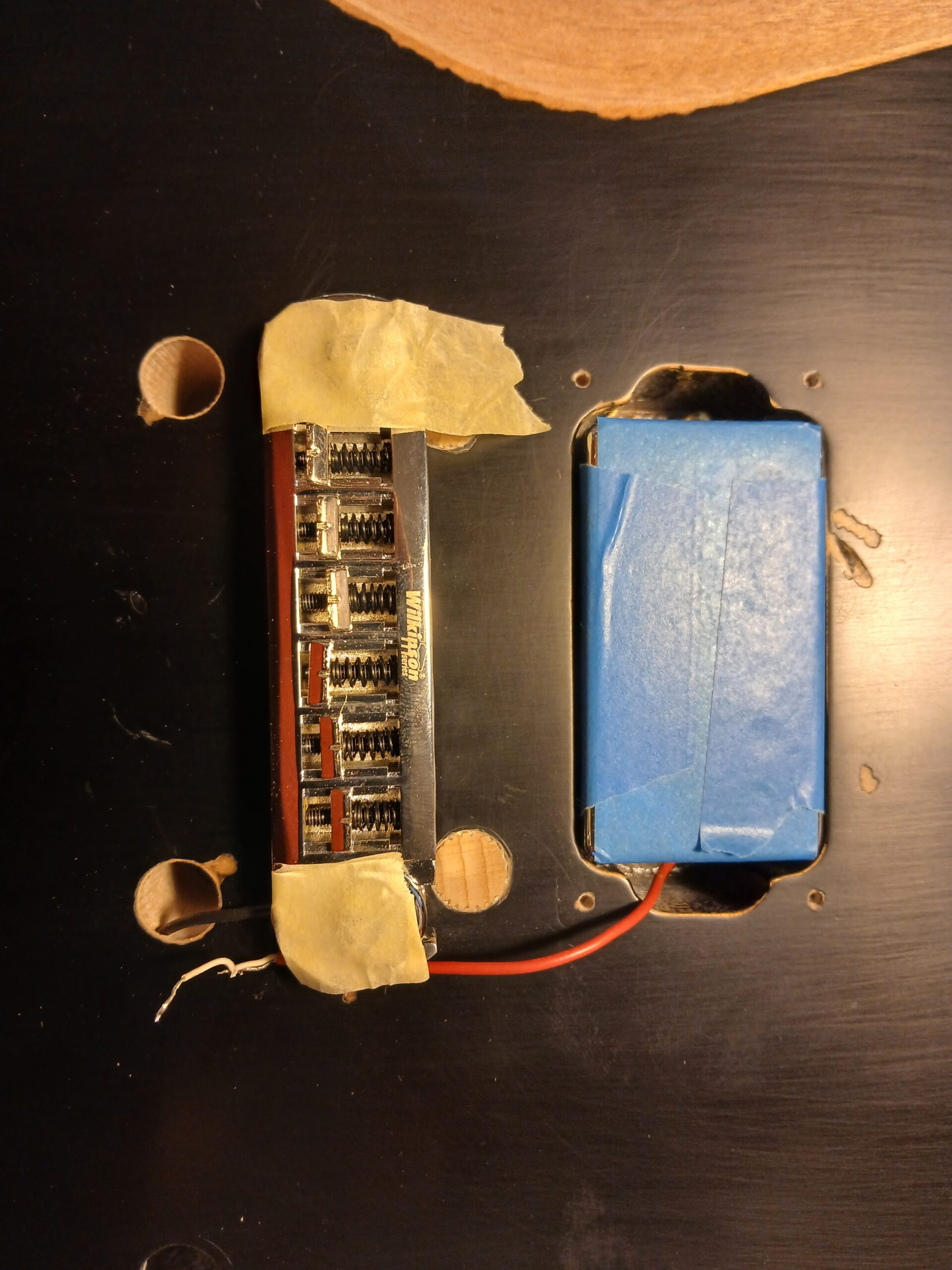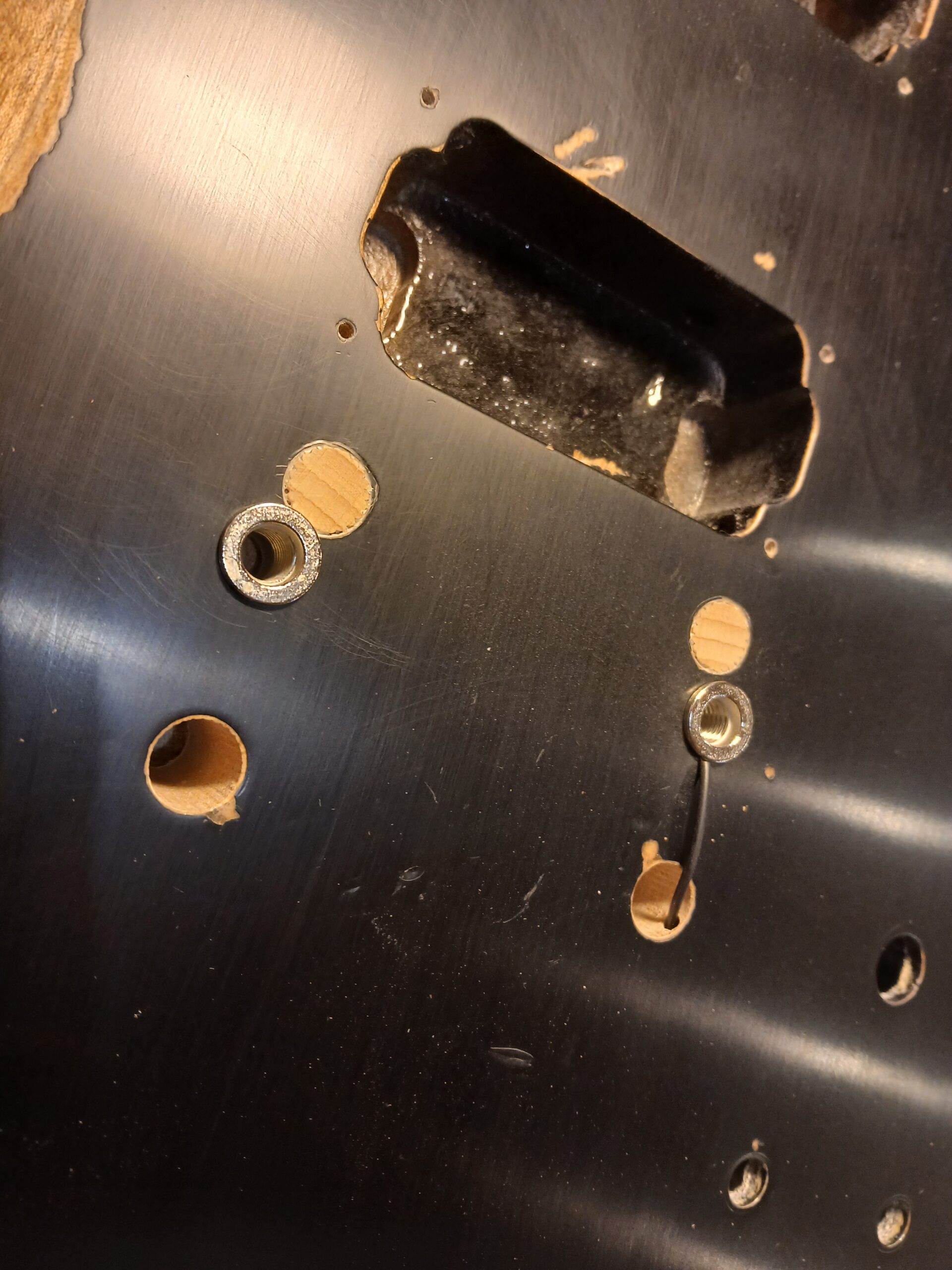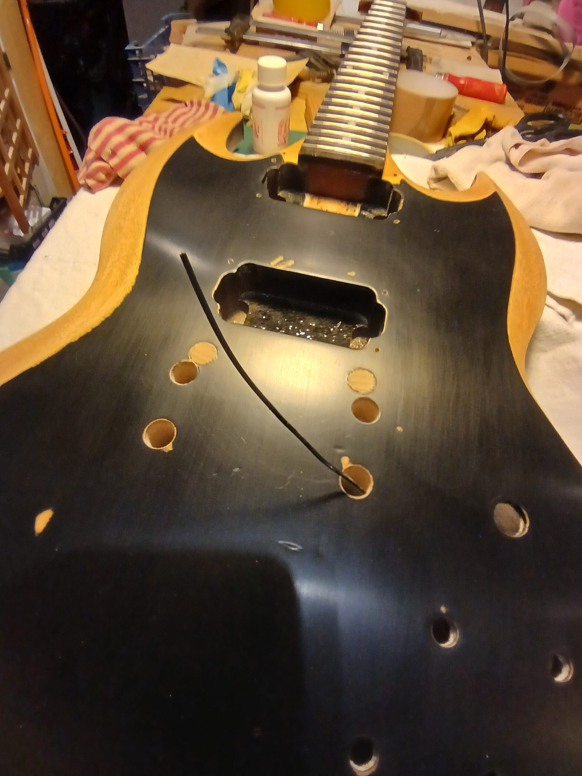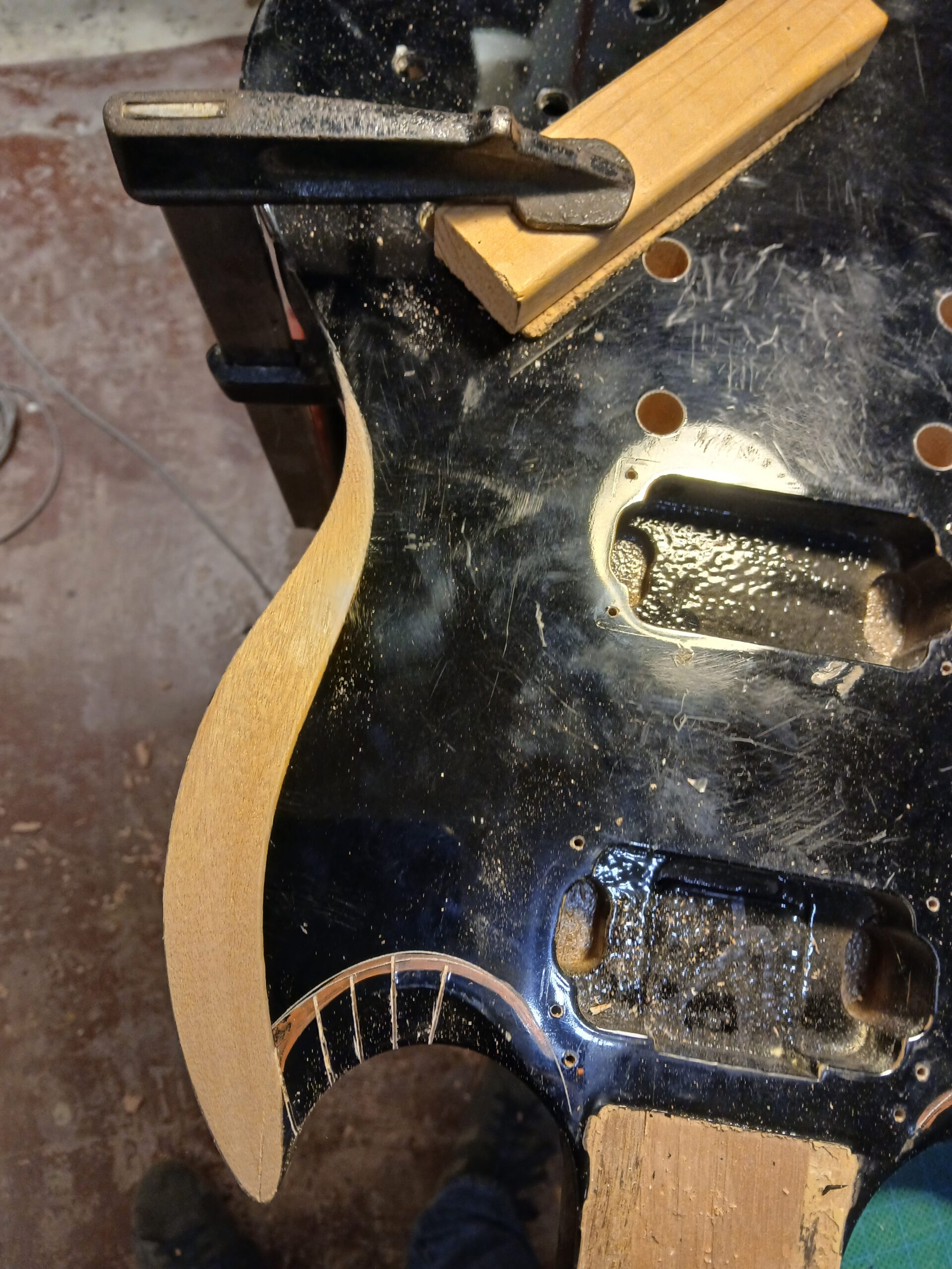 J’en ai profité pour faire des gabarits du corps et du wraparound. C’était une copie de SG, que je transforme en copie de SG junior, et comme elle aura un côté bourlingue, elle s’appelle SG sénior. Avec un micro humbucker capoté, un volume et une tonalité.