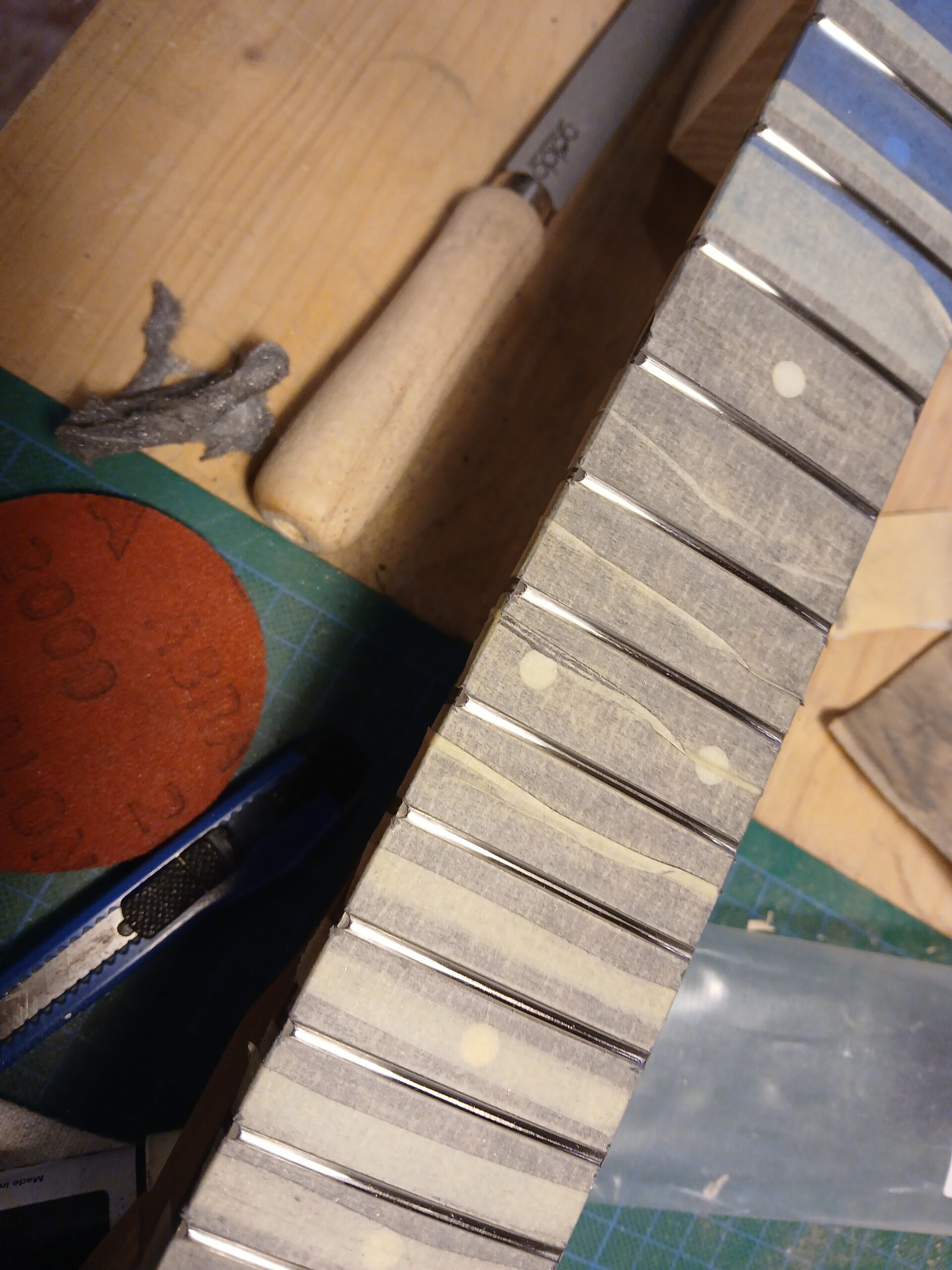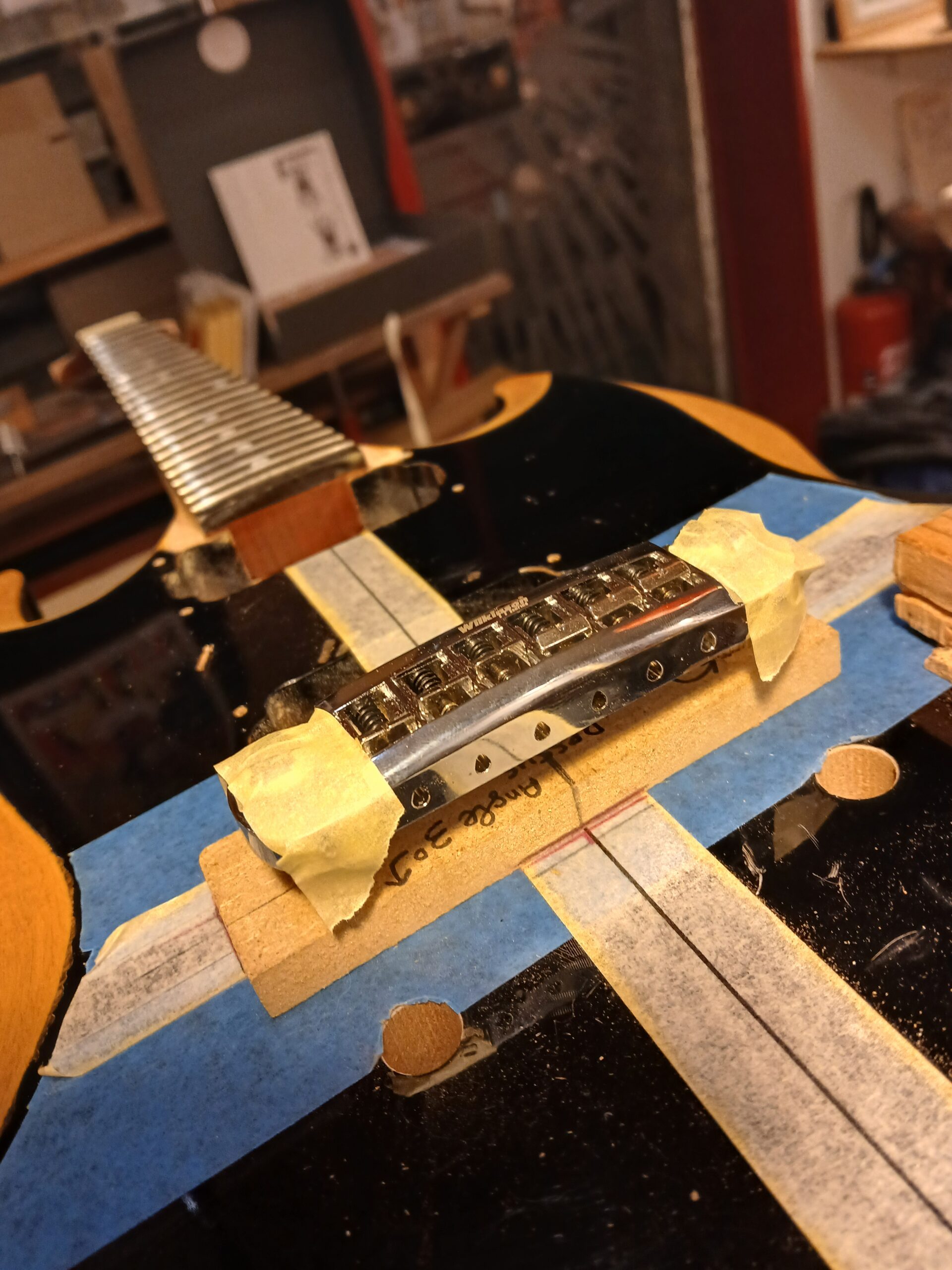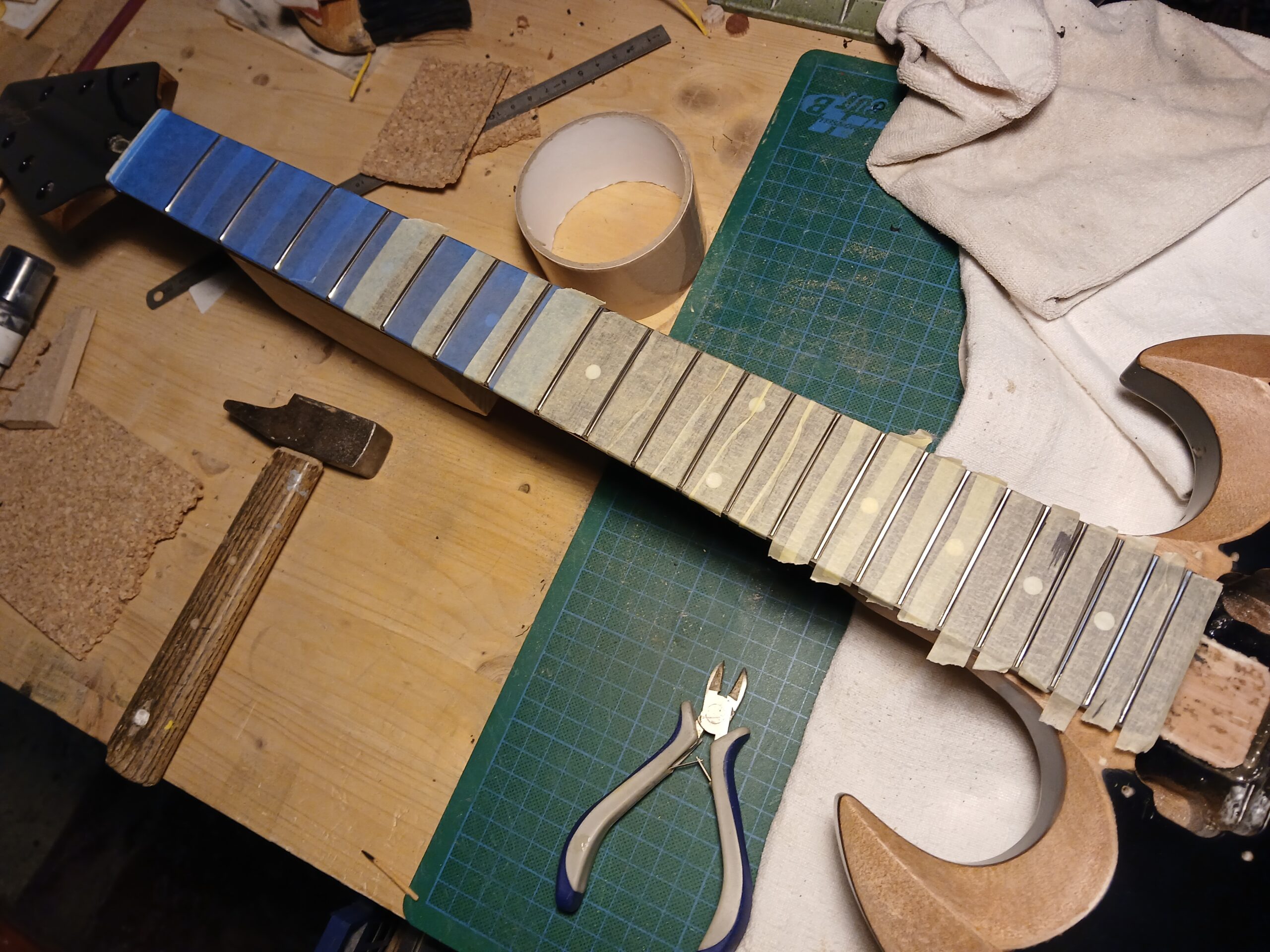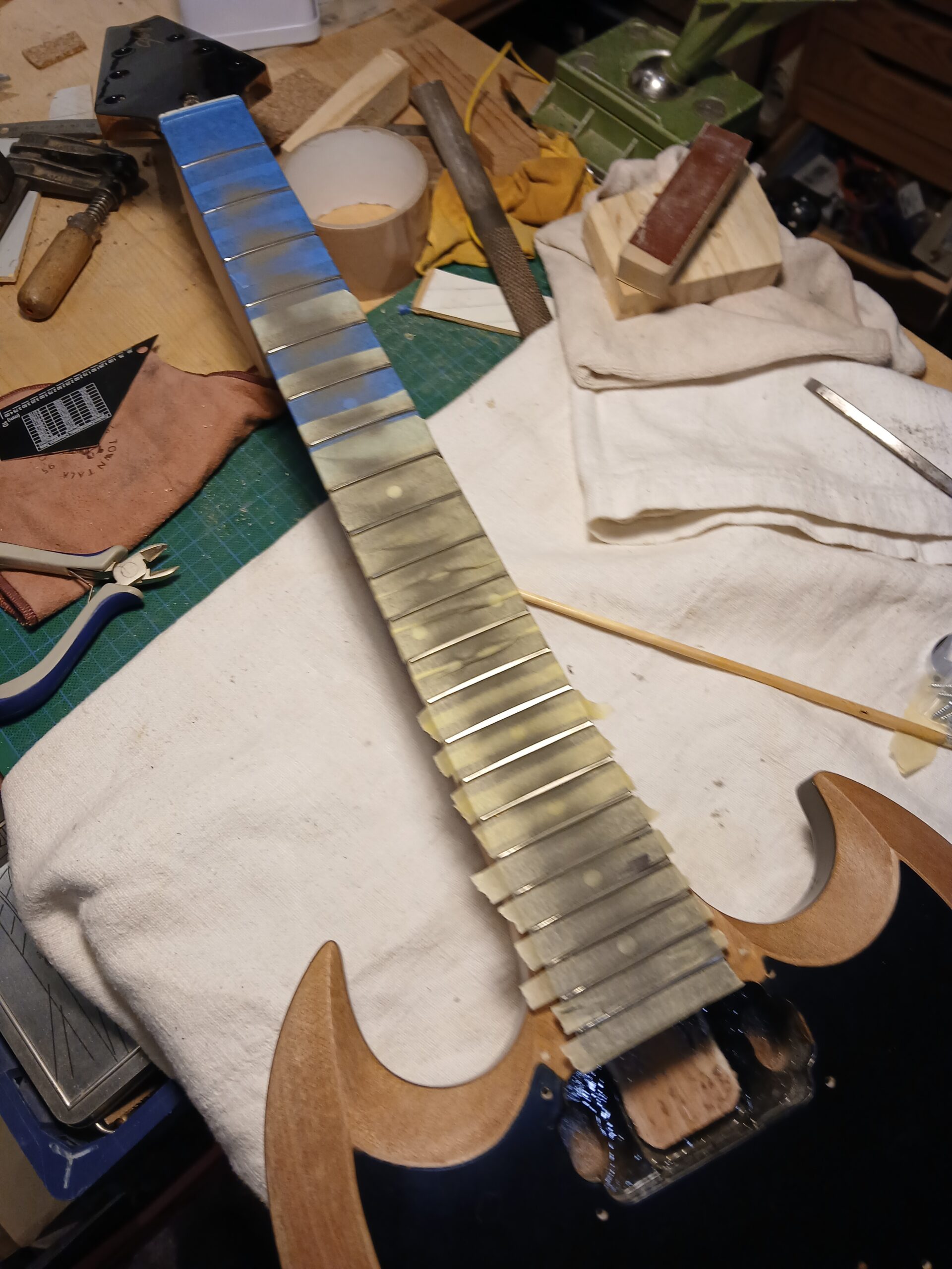 Enfin, ponçage du vernis, planimétrie des frettes, câblage électrique, sillet en bois et enfin le réglage complet.