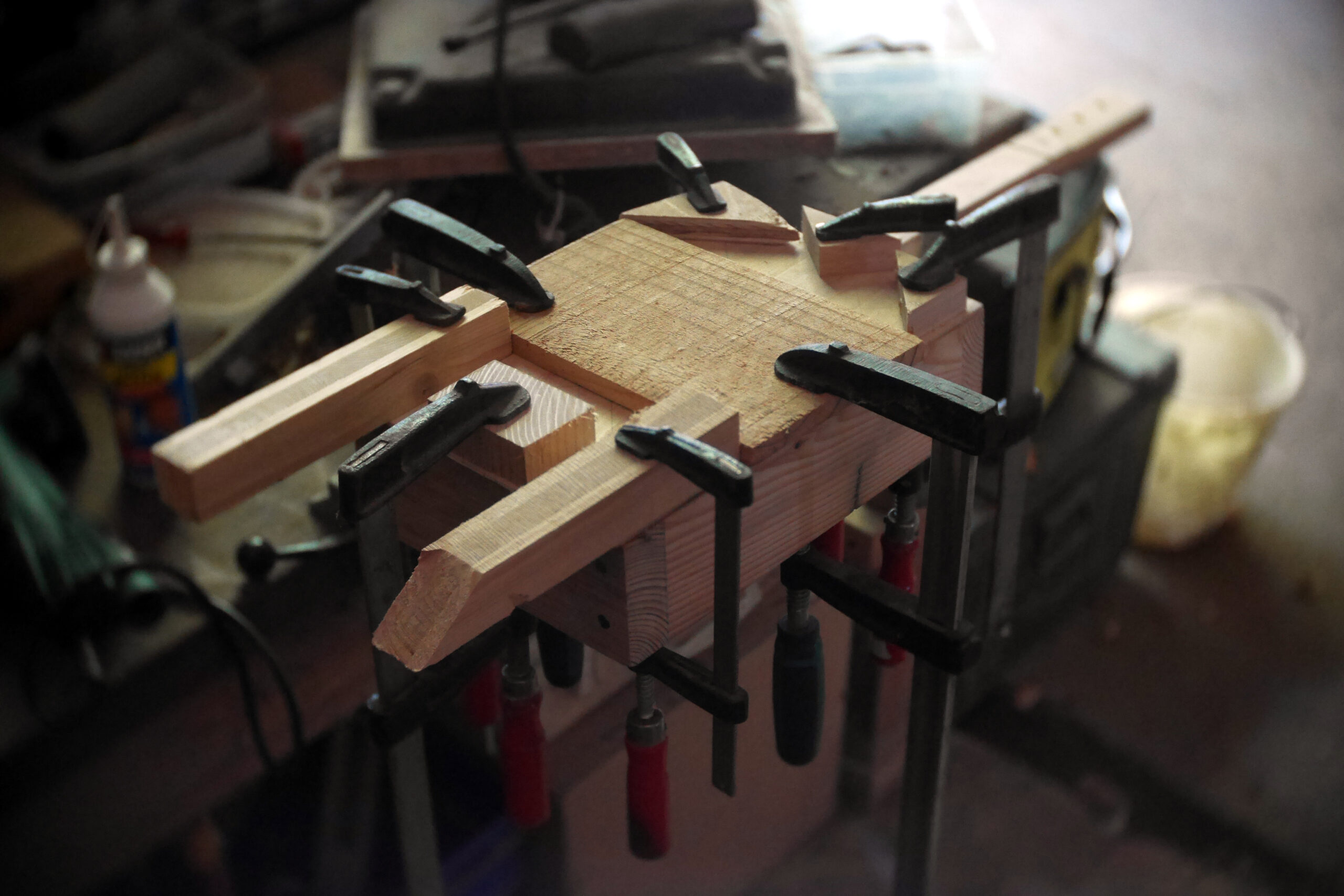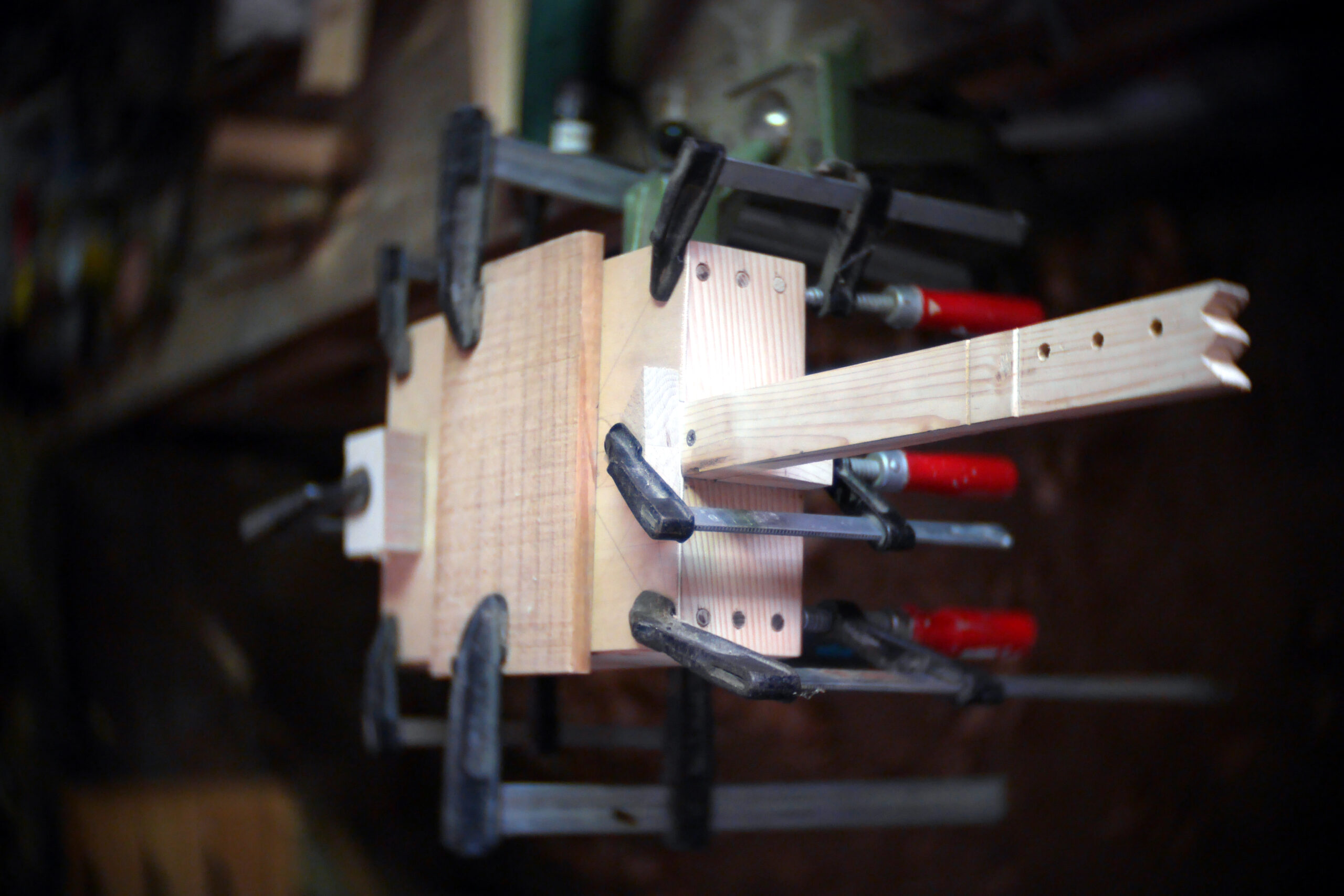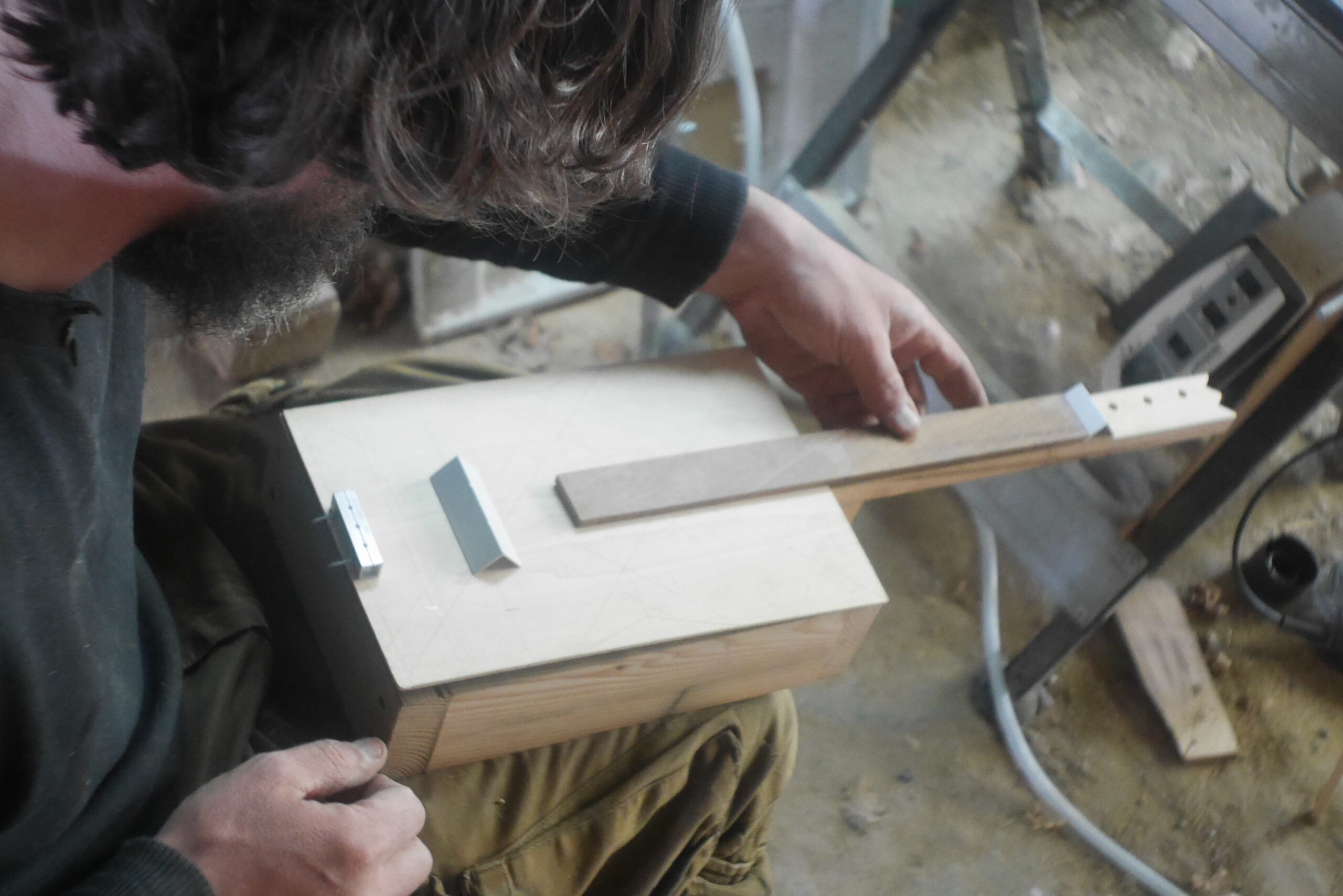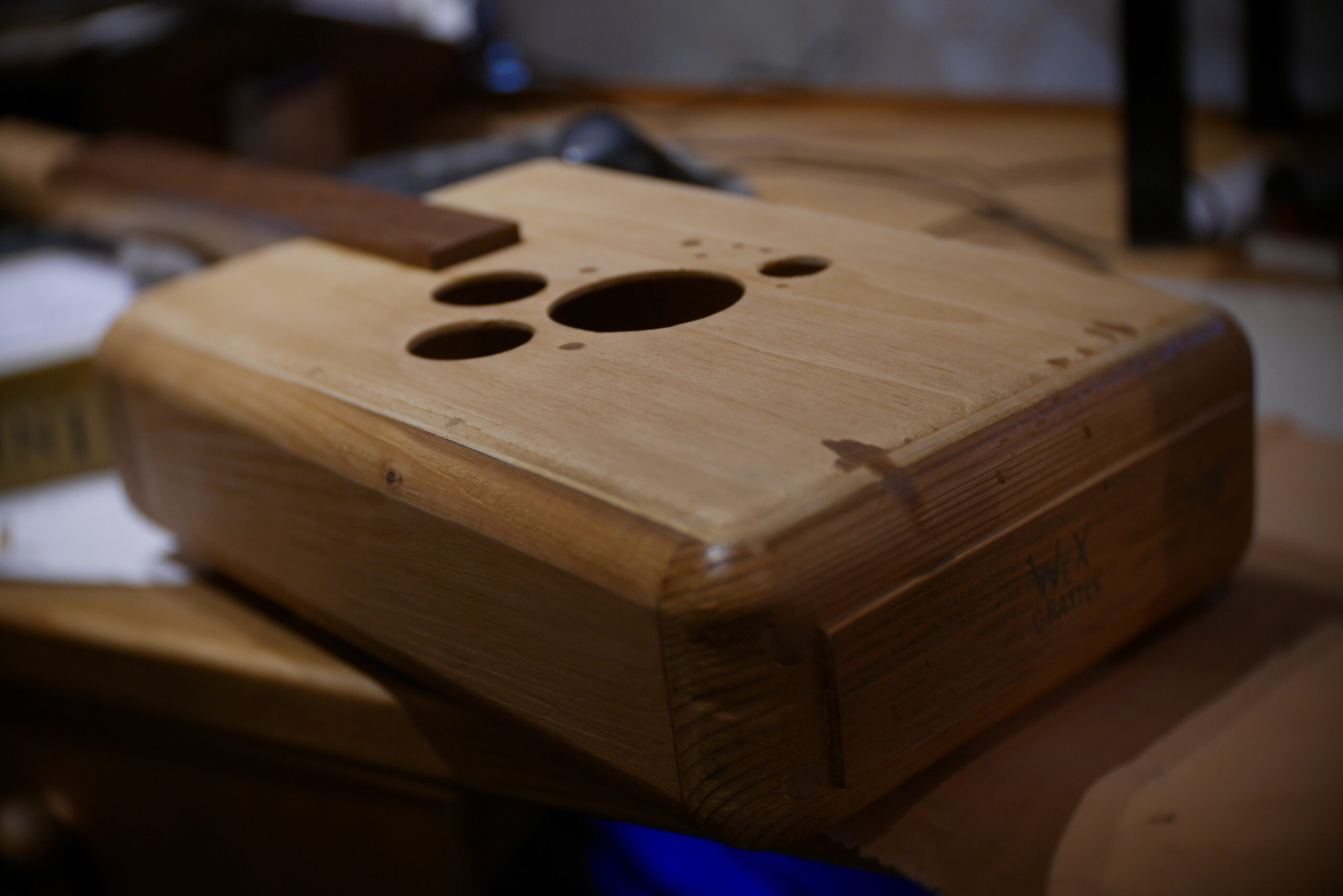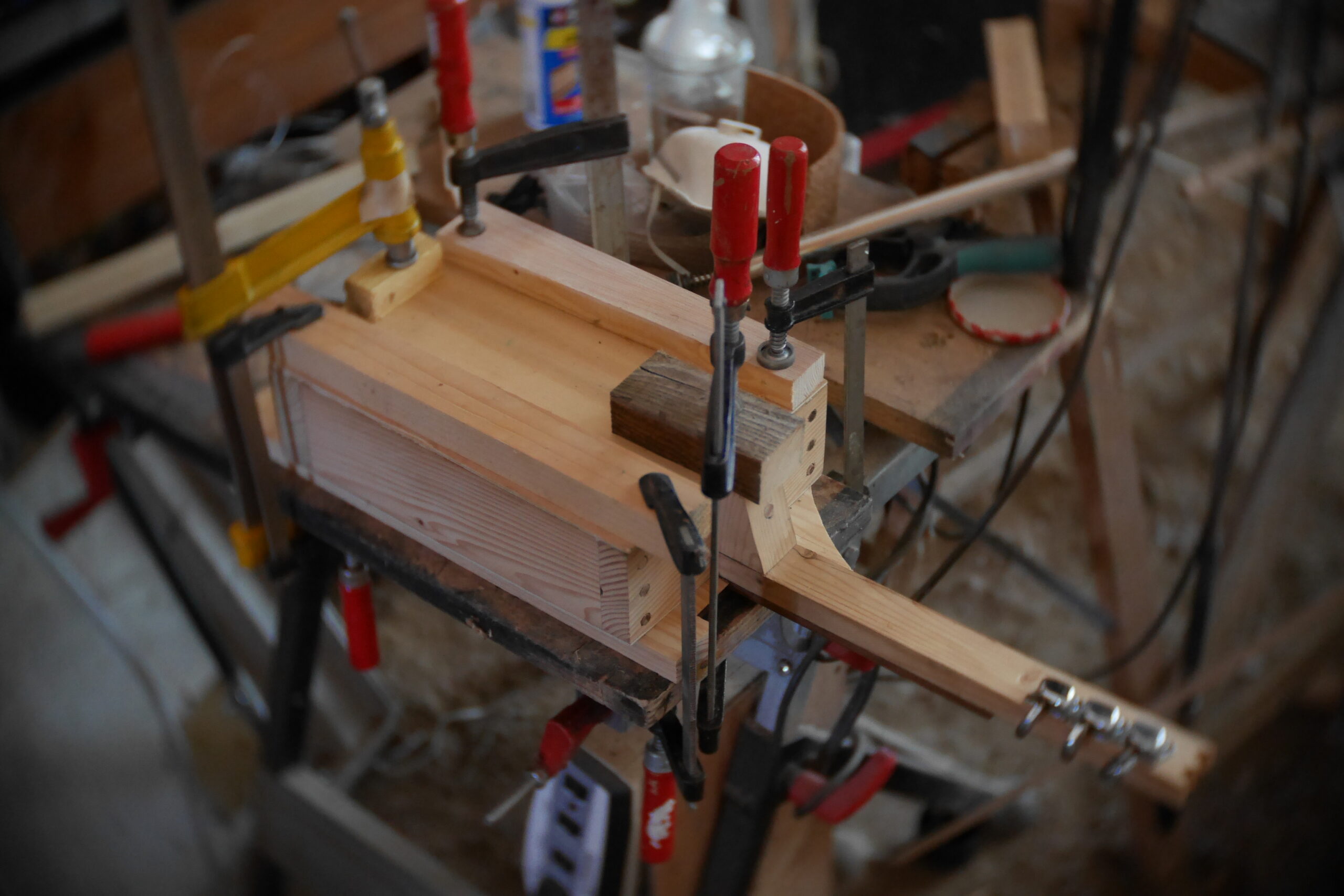 C’est la première, et j’ai donc peu de photos de sa construction. Ce que je peux vous dire, c’est que les bords de la caisse font 3 cm d’épaisseur, le manche qui accueille trois cordes est vissé et collé, les tables d’harmonies sont en contre plaqué de cagette.