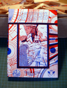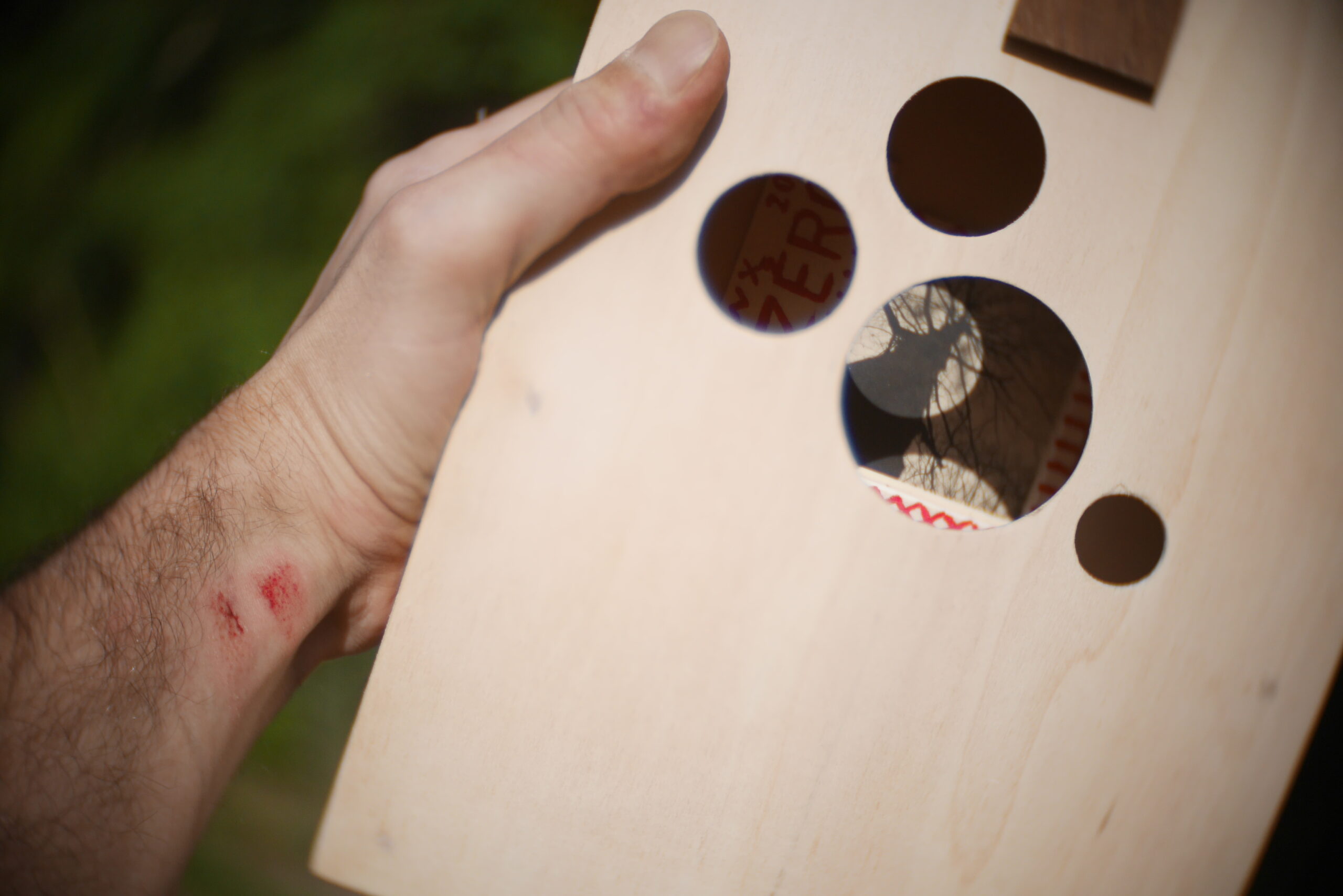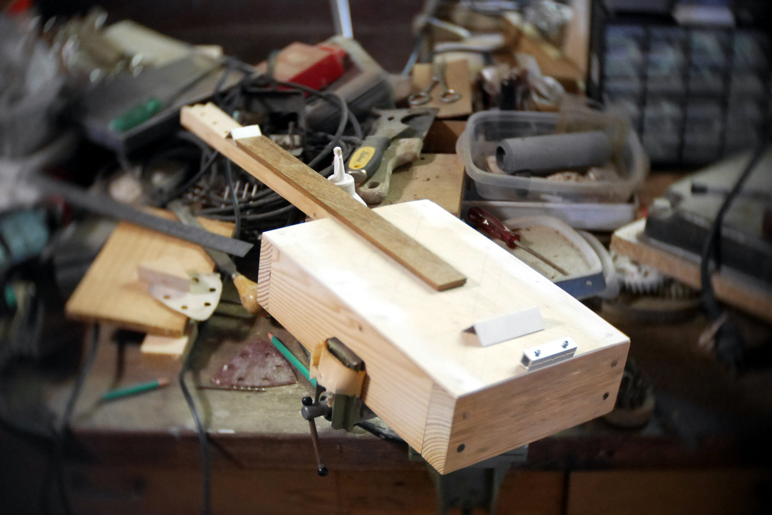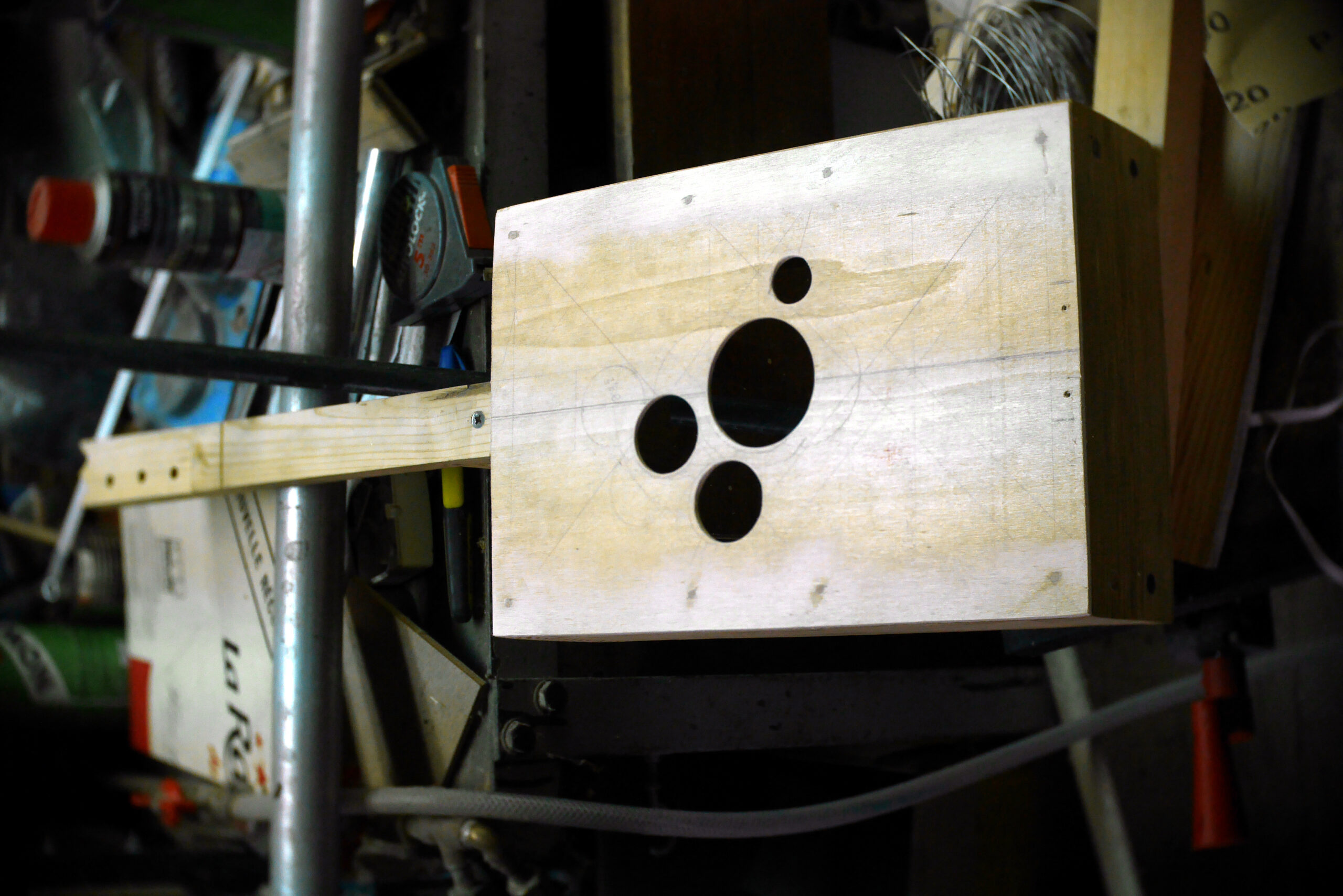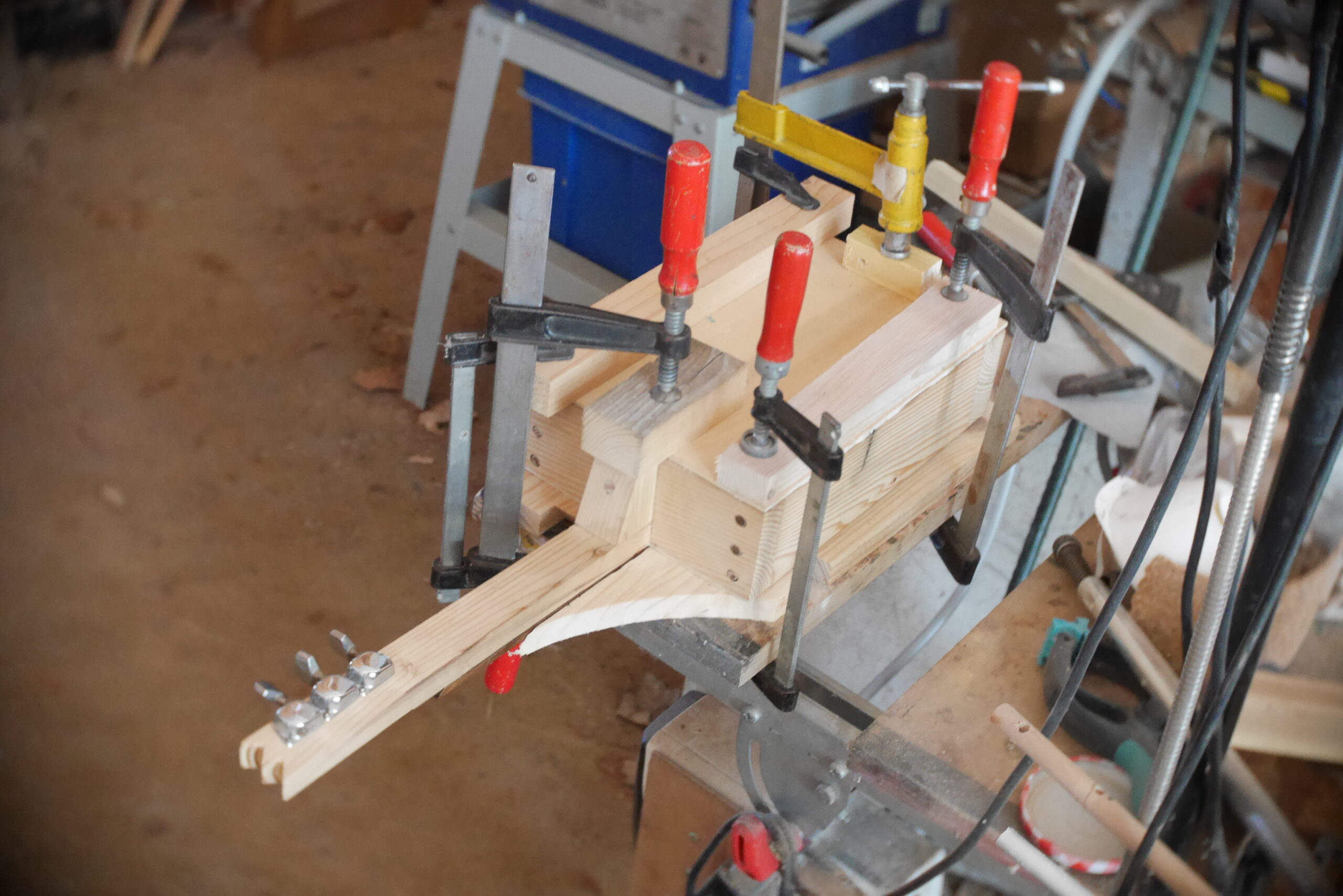 C’est la première, et j’ai donc peu de photos de sa construction. Ce que je peux vous dire, c’est que les bords de la caisse font 3 cm d’épaisseur, le manche qui accueille trois cordes est vissé et collé, les tables d’harmonies sont en contre plaqué de cagette.