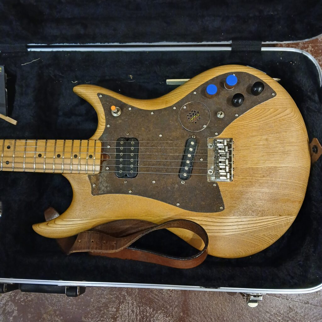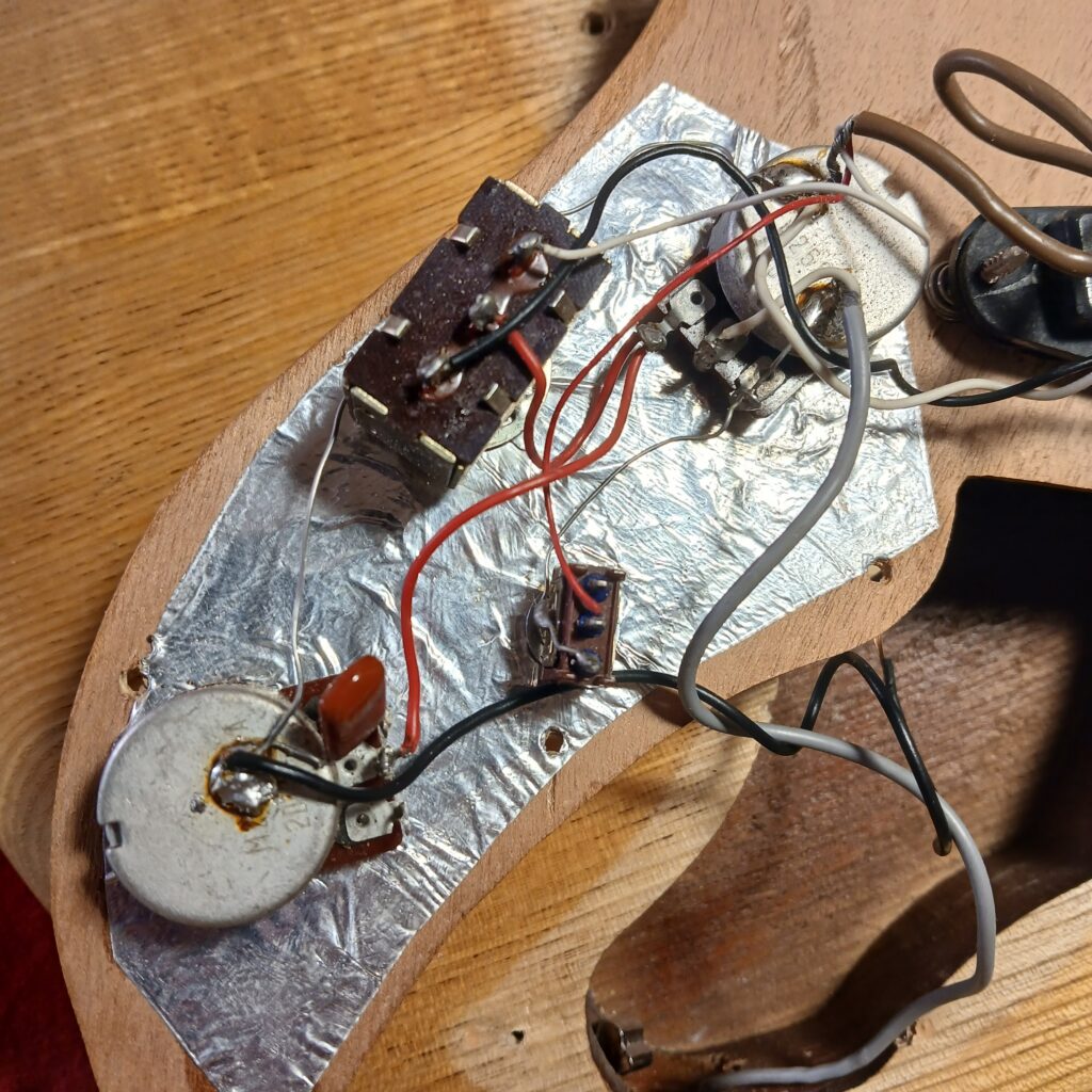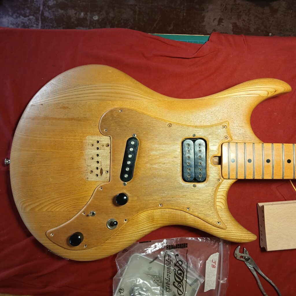 L’exemplaire qui arrive à l’atelier est celui de JB, qu’il a dégotté d’occasion, et qui a déjà été modifié. Le vernis marron à été poncé, les angles saillant ont été arrondis, le pickguard à été refait avec du contre-plaqué… D’un style trop sombre, elle est devenue trop pâle et sans caractère. Les frettes sont usées et l’intonation est mauvaise.
