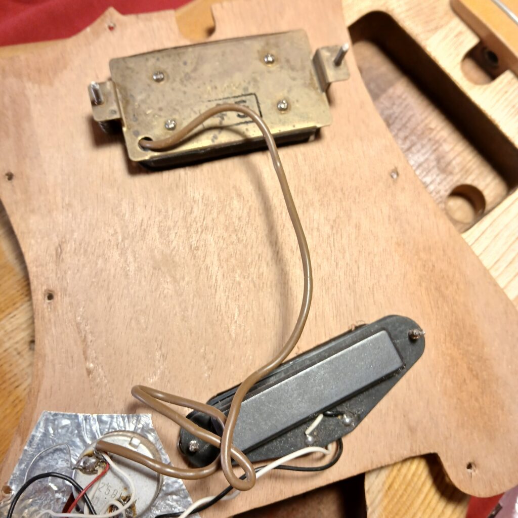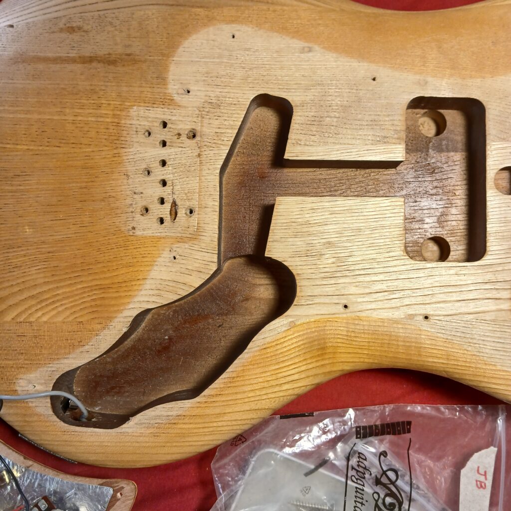 Le projet est donc de lui rendre un peu de charisme et de remettre tout ça à neuf avec une planification des frettes, un piezo sous le talon du manche, un nouveau pickguard qui accueillera 2 nouveaux potards de volume et tonalité, et repositionner les réglages existants, et donc de modifier la cavité électronique.