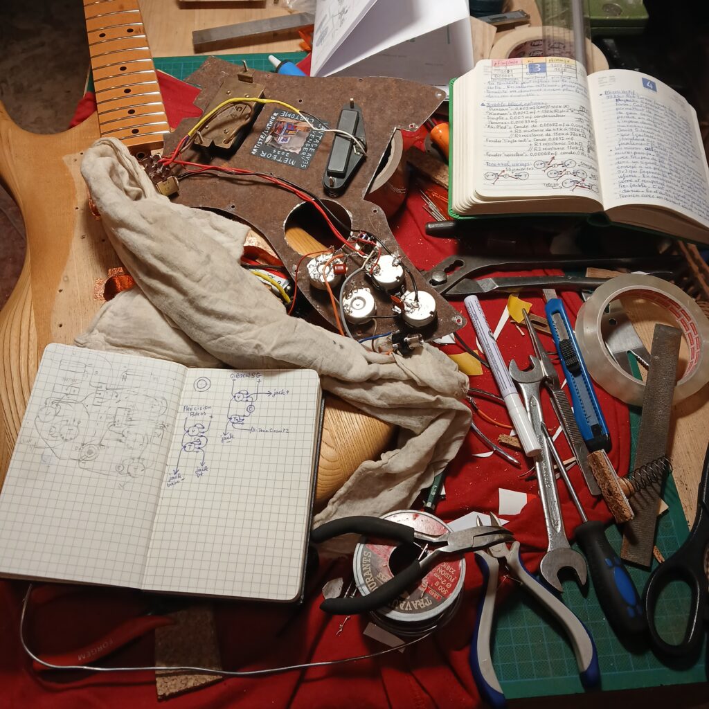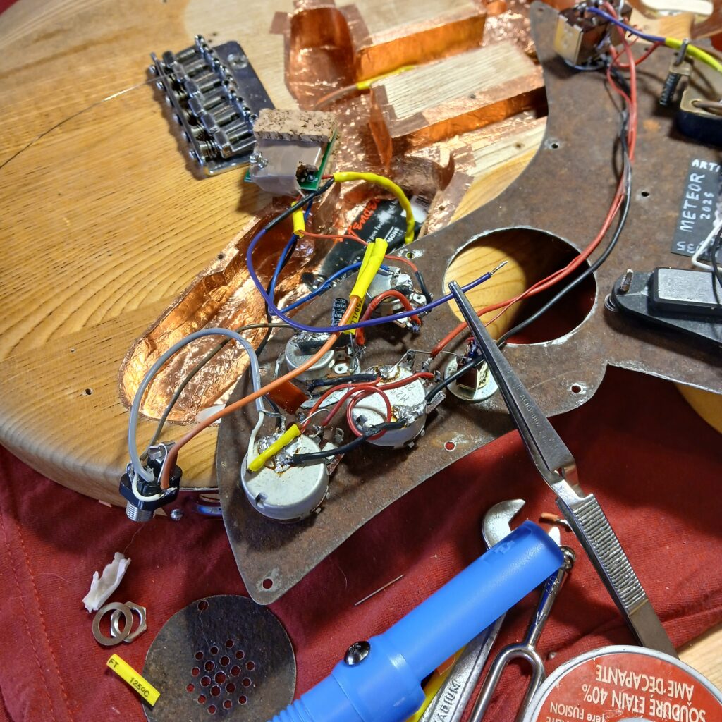 JB est un guitariste expérimental, à la recherche de sons et de manières d’en produire. Ils voulait poser un piezo au niveau du talon du manche pour capter les sons extra-magnétiques comme ceux produits au-delà du sillet ou d’un capodastre. Ce piezo devait être modulable avec un duo volume-tonalité et surtout, c’est là que ça s’est compliqué, mixable avec les micros magnétiques…