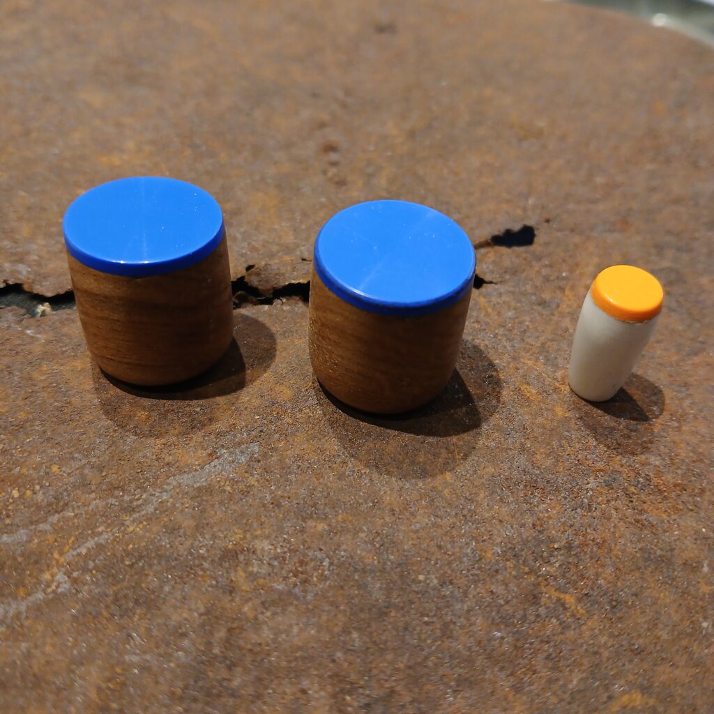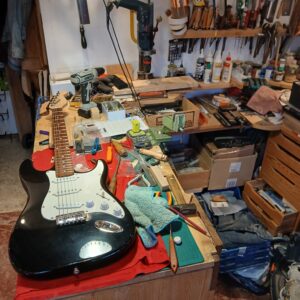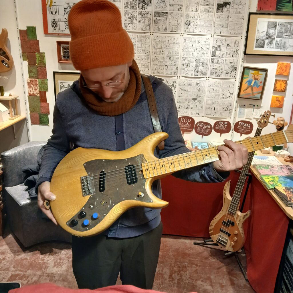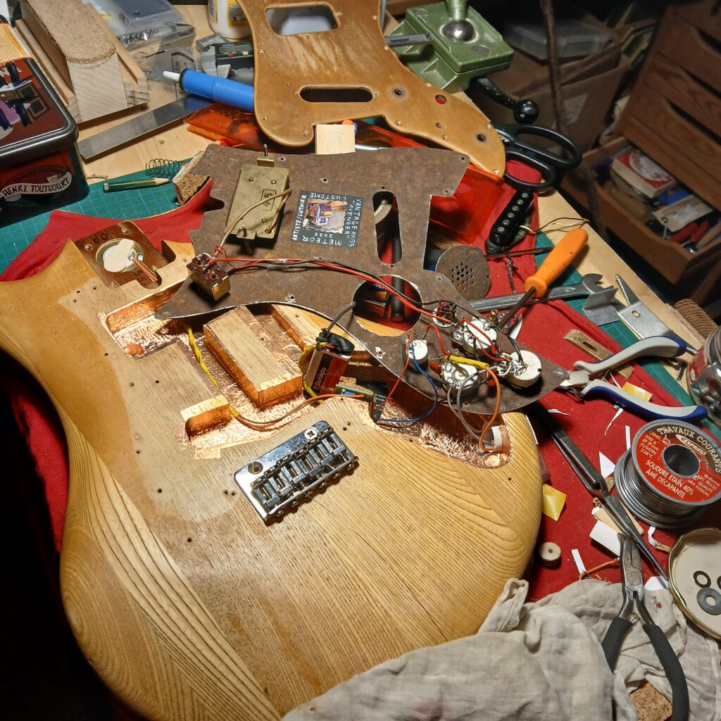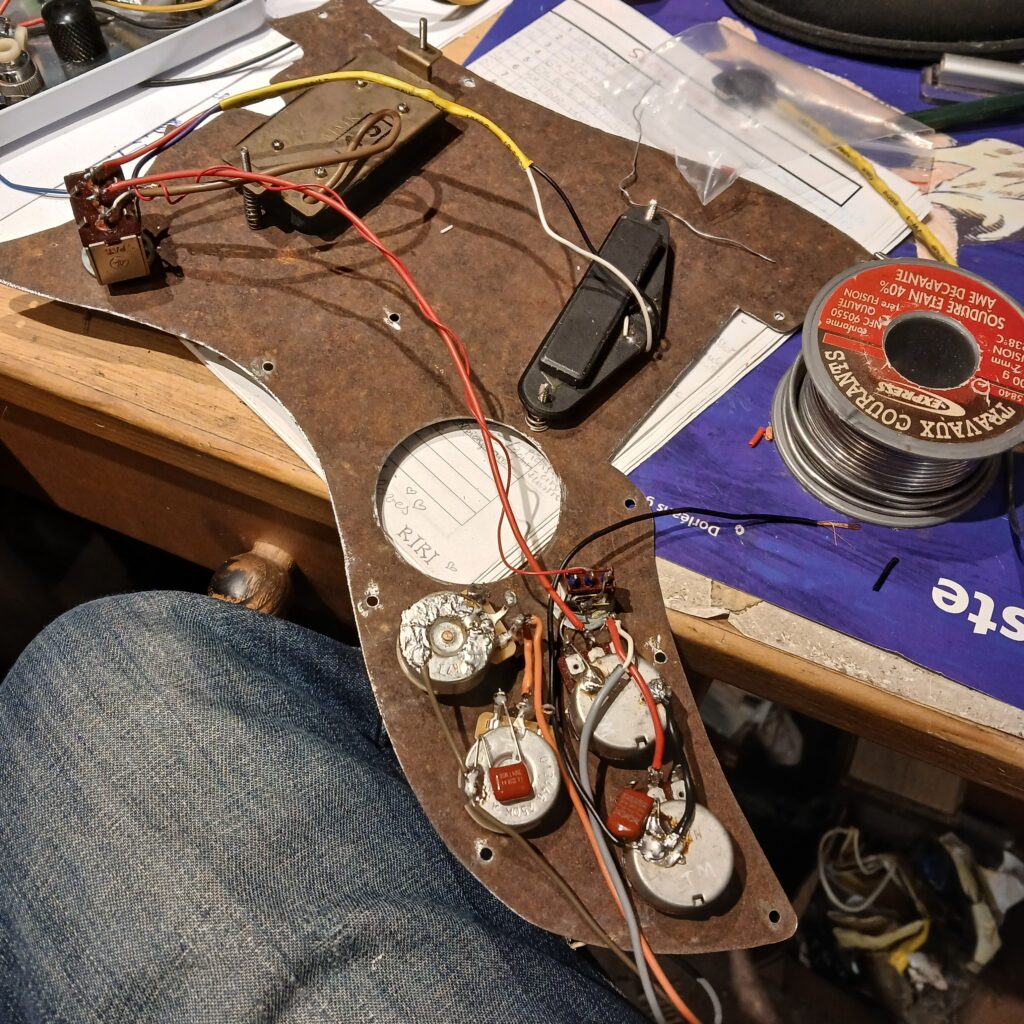 Il ne restait plus qu’à tester tout ça, avec JB, puis à tout remonter et régler. Un manche très légèrement creusé, une action F1 et F12 très basse, une intonation précise. Ne manquait plus que les boutons de potards, en cerisier, et de toggle switch en os, recouverts d’un plastique de brique de construction. JB aime les touches de couleur vive. Voilà une guitare remise à neuf pour un guitariste visiblement heureux.