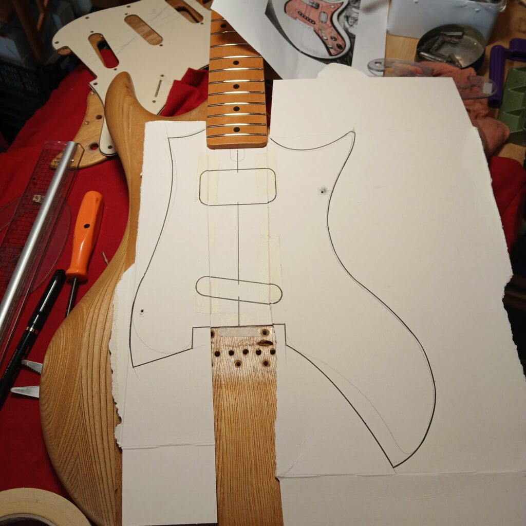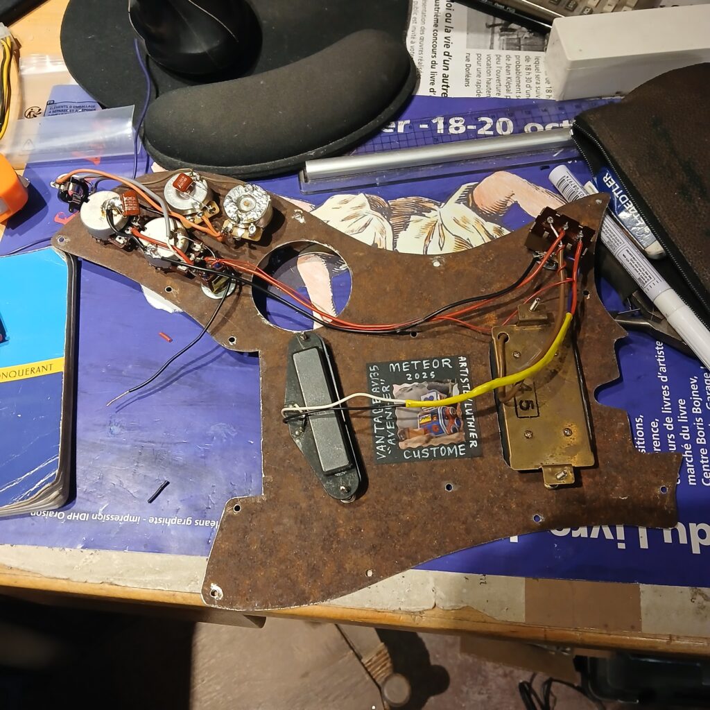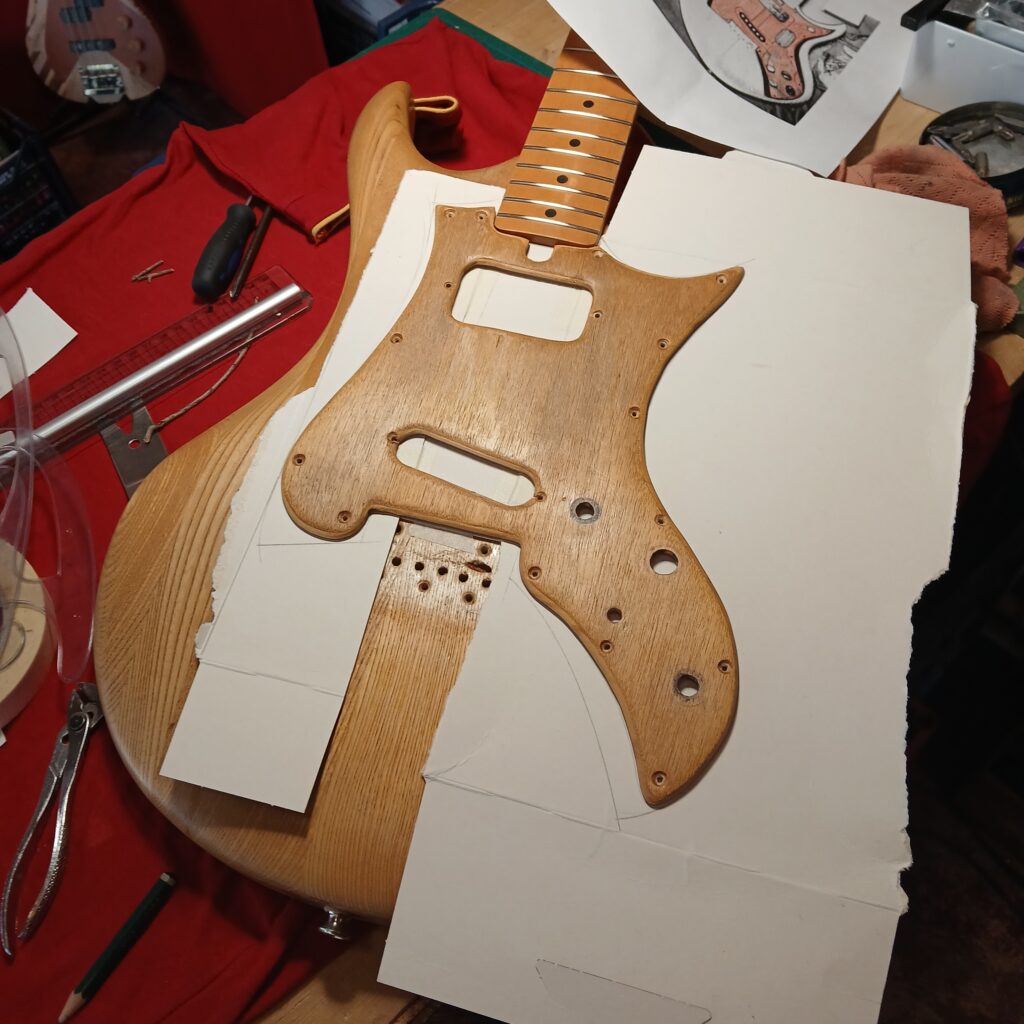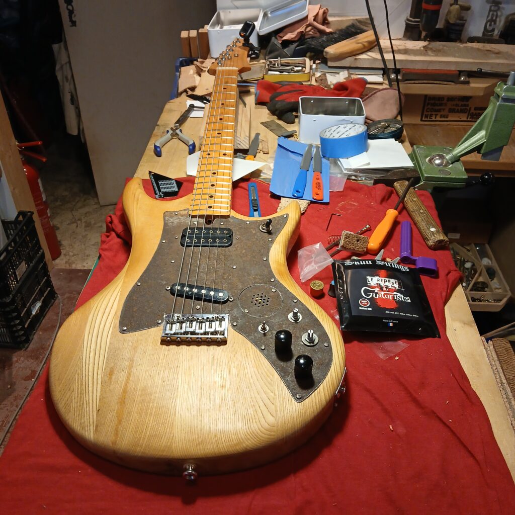 Je continue avec la création du nouveau pickguard, en commençant par le patron en carton. La forme finale est sensiblement la même que l’original (et sa copie en contre-plaqué) mais en plus imposant, pour donner de la place à l’électronique mais aussi pour couvrir les anciens trous de vis… Et surtout il est coupé dans une plaque de fer rouillé et cabossée trouvée en forêt.