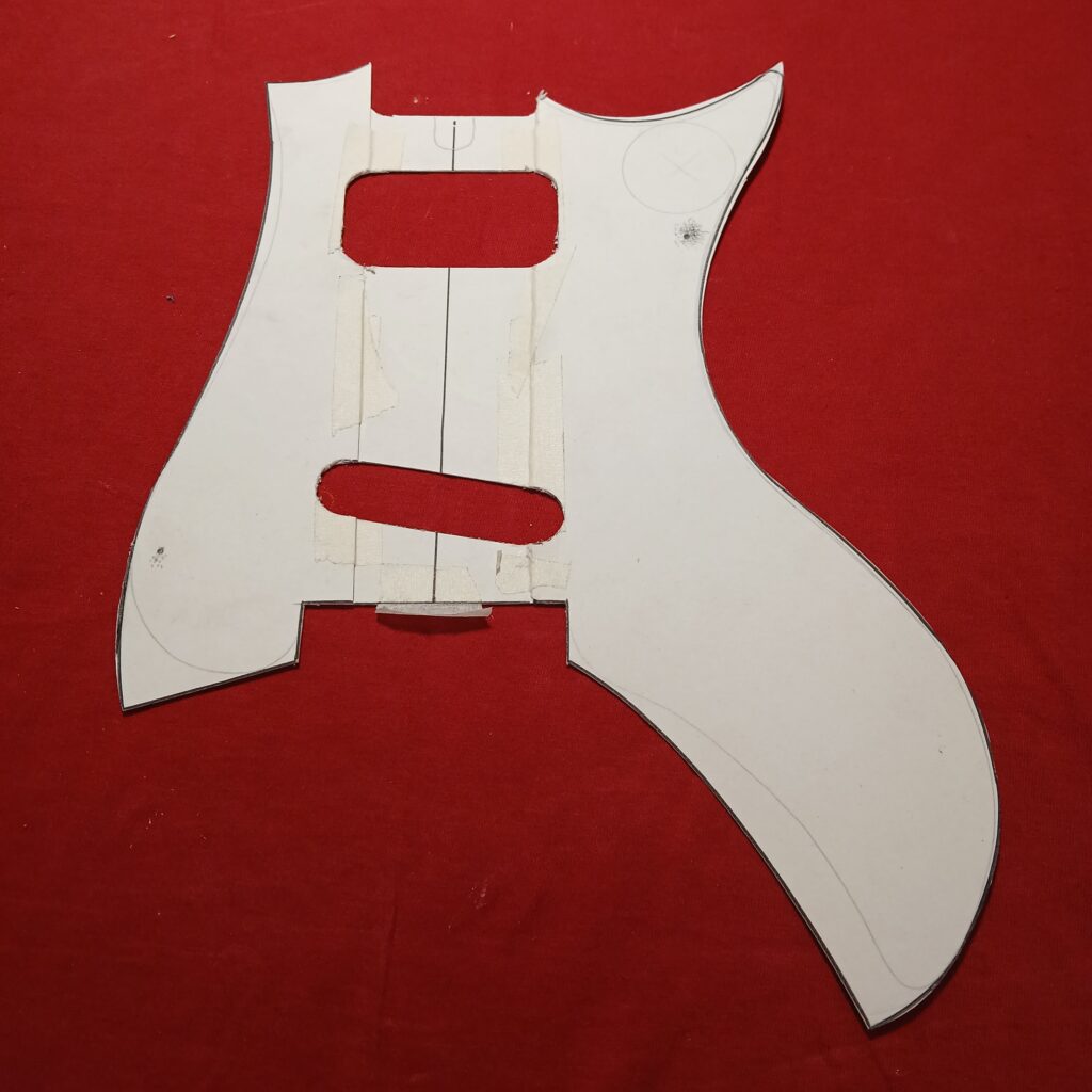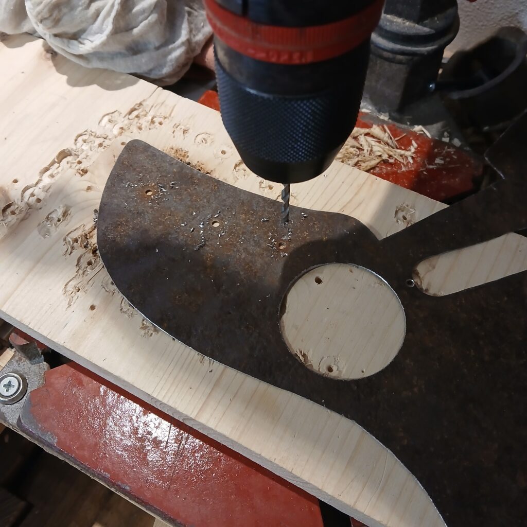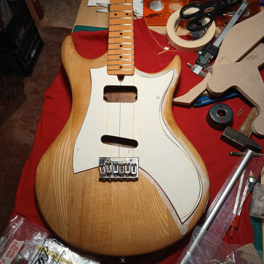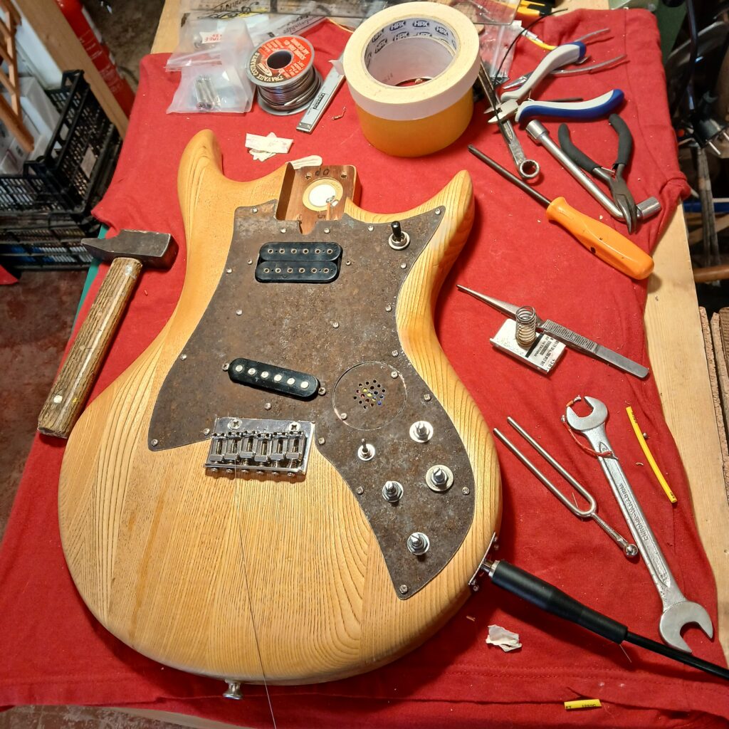 Je continue avec la création du nouveau pickguard, en commençant par le patron en carton. La forme finale est sensiblement la même que l’original (et sa copie en contre-plaqué) mais en plus imposant, pour donner de la place à l’électronique mais aussi pour couvrir les anciens trous de vis… Et surtout il est coupé dans une plaque de fer rouillé et cabossée trouvée en forêt.
