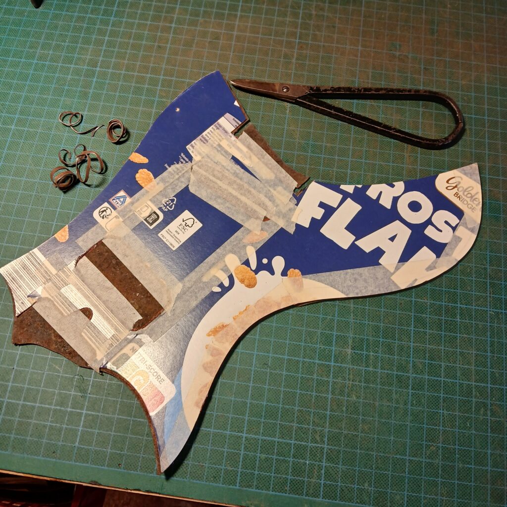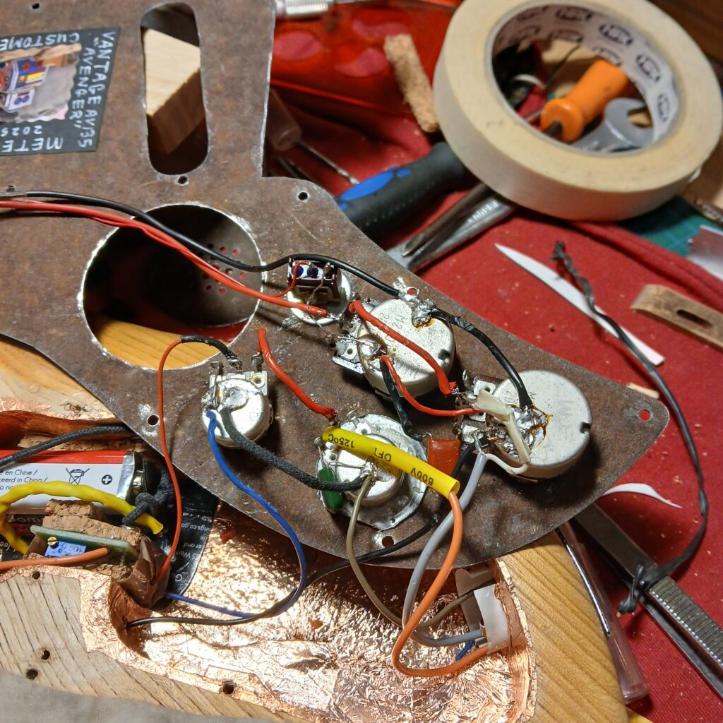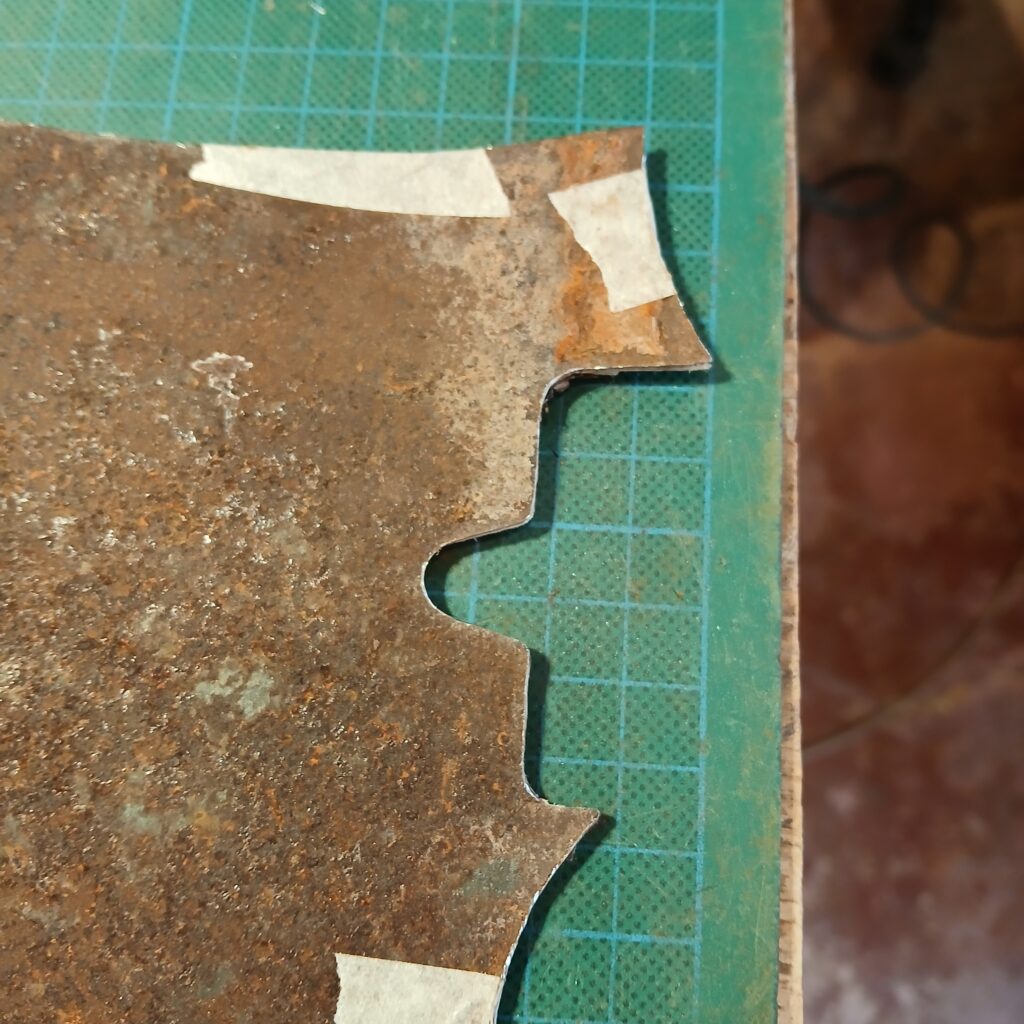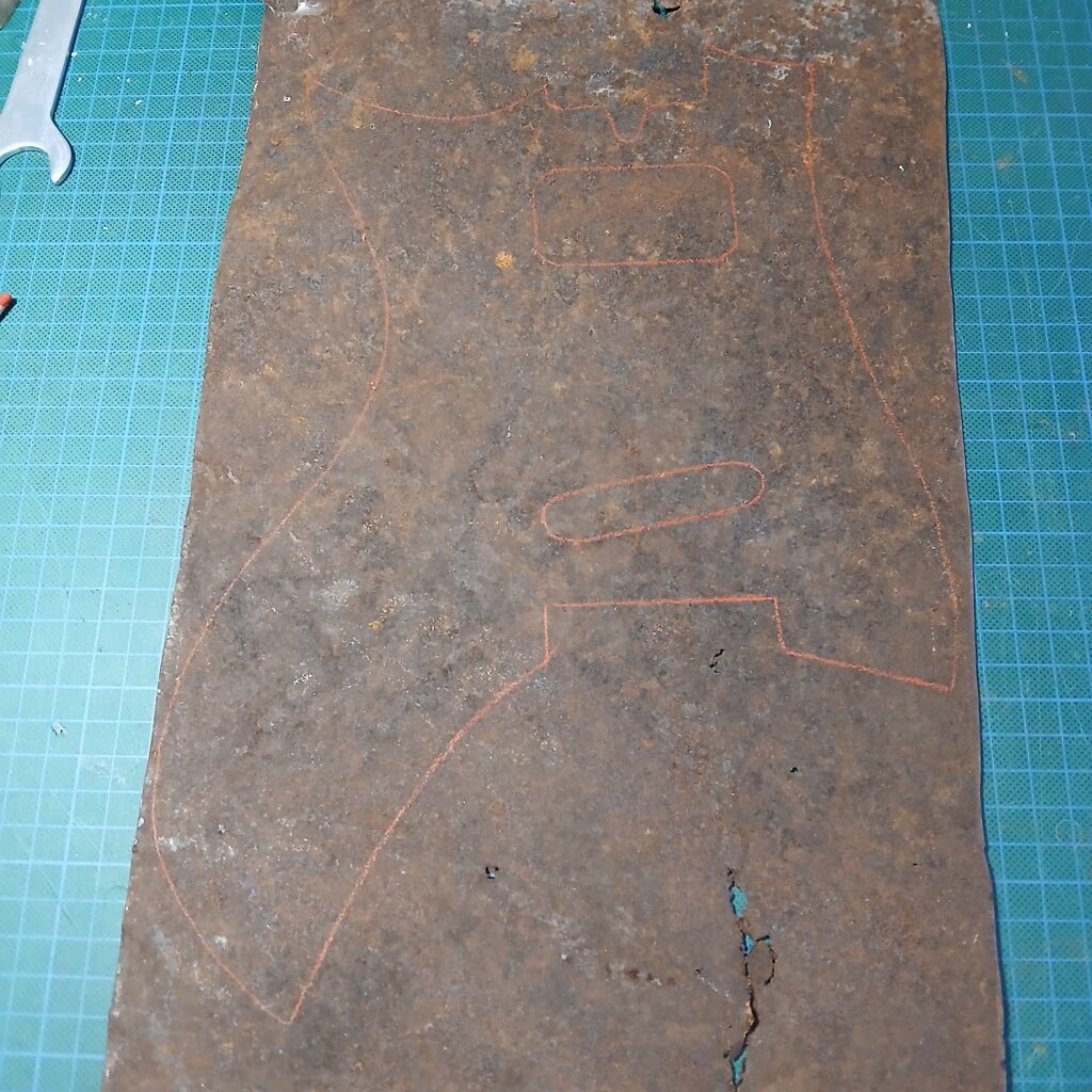 Je continue avec la création du nouveau pickguard, en commençant par le patron en carton. La forme finale est sensiblement la même que l’original (et sa copie en contre-plaqué) mais en plus imposant, pour donner de la place à l’électronique mais aussi pour couvrir les anciens trous de vis… Et surtout il est coupé dans une plaque de fer rouillé et cabossée trouvée en forêt.