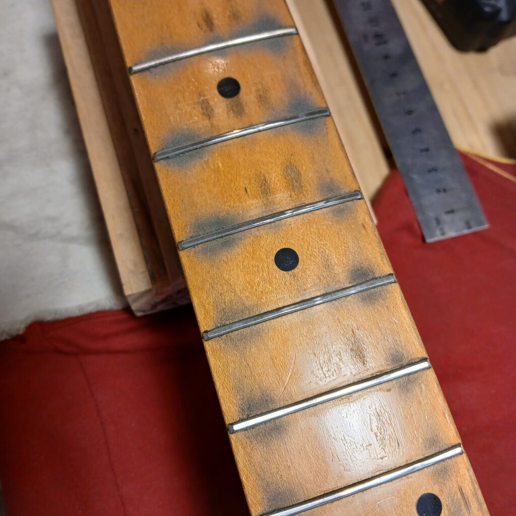 Je commence par démonter la gratte et m’attaque à la planification des frettes en 7,25 pouces. Un radius légèrement différent de l’original, plus arrondis… Pour jouer à l’archer 😉