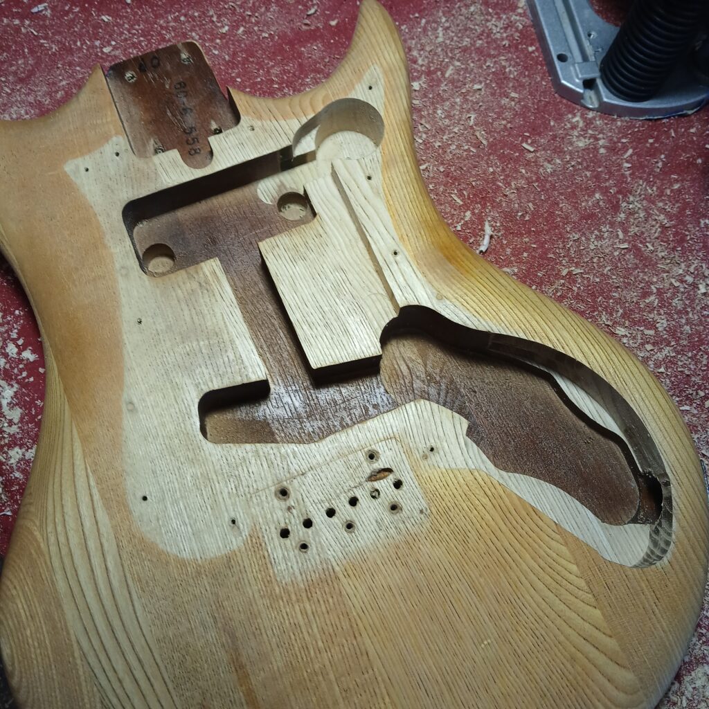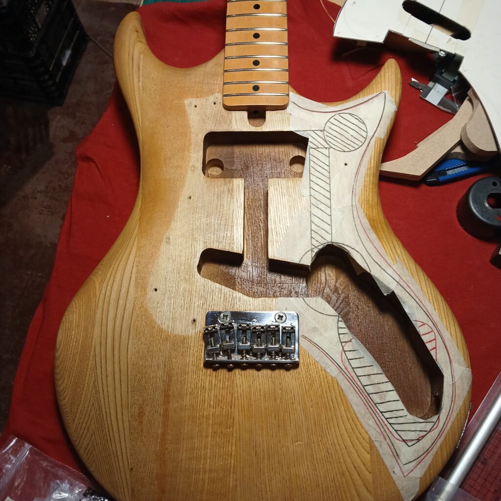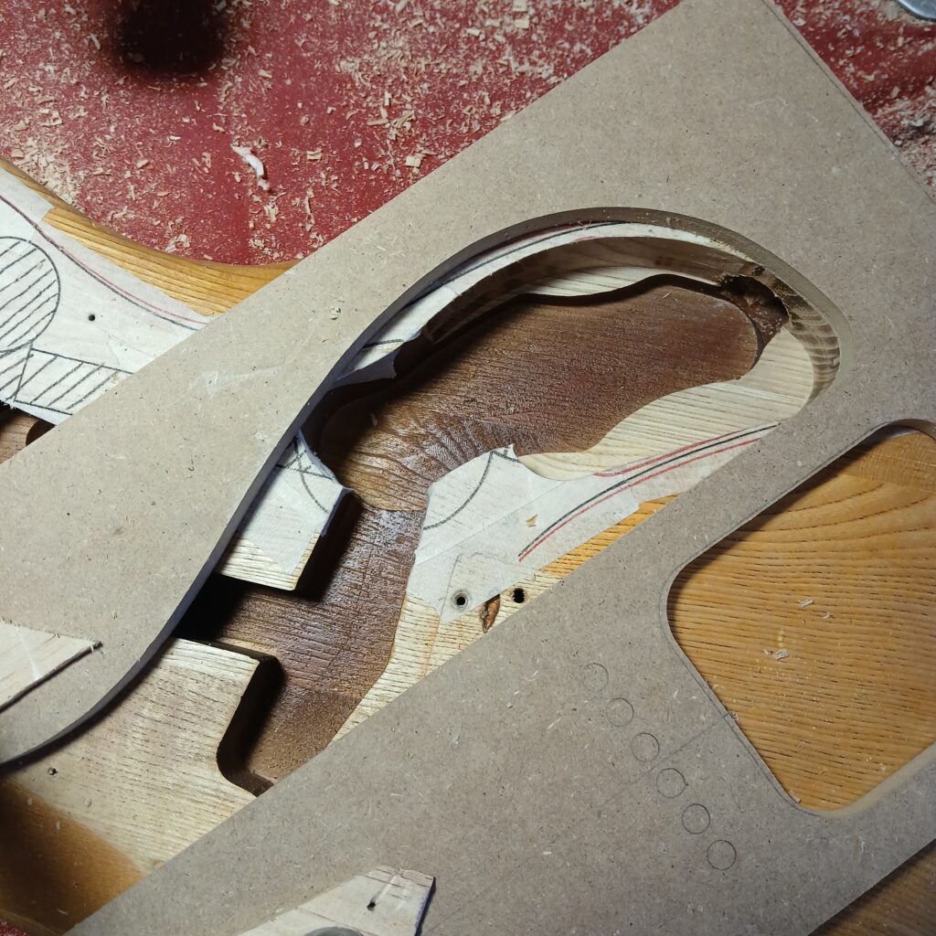 Après ça, je détermine l’agrandissement de la cavité électro, et défonce avec une règle courbe (ici un gabarit de cavités de Telecaster Thinline). Je rajoute un espace pour le toggle switch dans la corne coté aigües, ainsi qu’une gouttière pour passer les câbles.