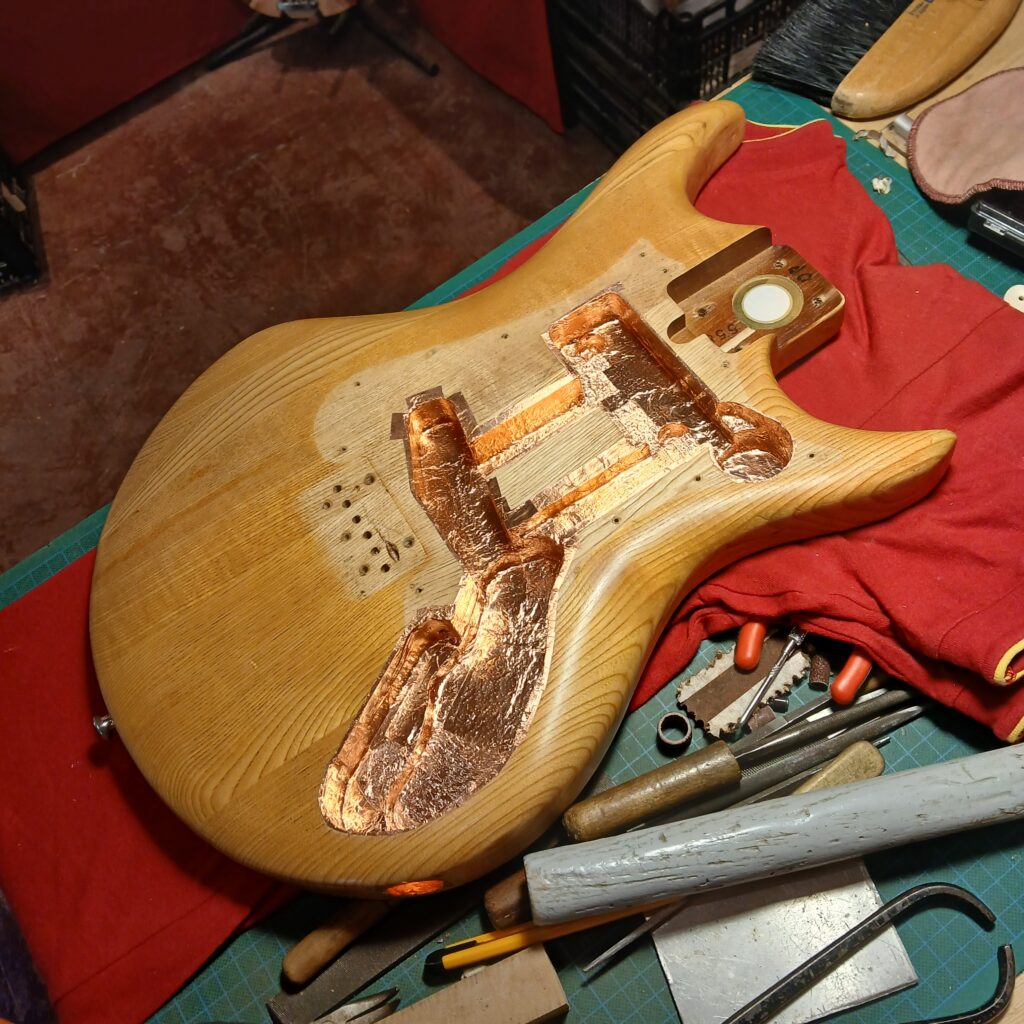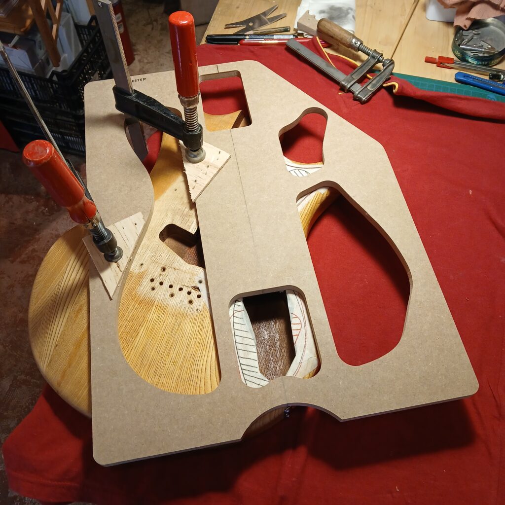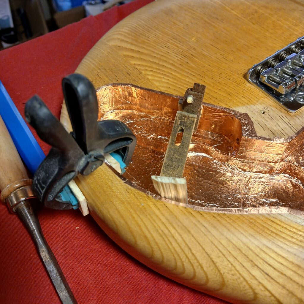 Après ça, je détermine l’agrandissement de la cavité électro, et défonce avec une règle courbe (ici un gabarit de cavités de Telecaster Thinline). Je rajoute un espace pour le toggle switch dans la corne coté aigües, ainsi qu’une gouttière pour passer les câbles.