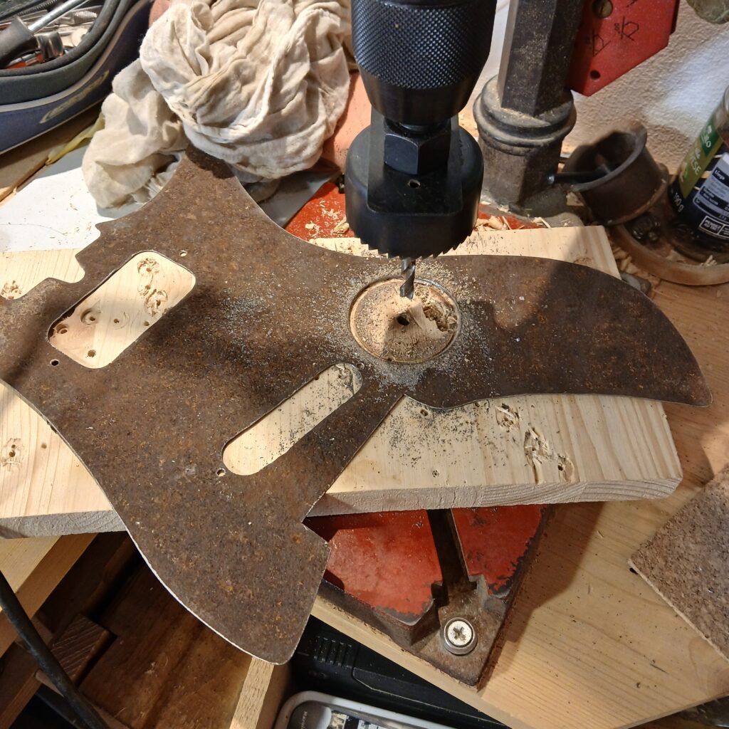 J’ai eu un peu d’aide de la part de JB pour la découpe grossière de la plaque avec un nibbler drill (grignoteur en français). J’ai ensuite affiné la découpe à la cisaille, puis au Dremel avec un rouleau abrasif. J’ai ouvert les emplacements pour les micros à la perceuse, grossièrement, puis au Dremel. Le rendu est super cool. La surface rouillée est stable sans traitement particulier.